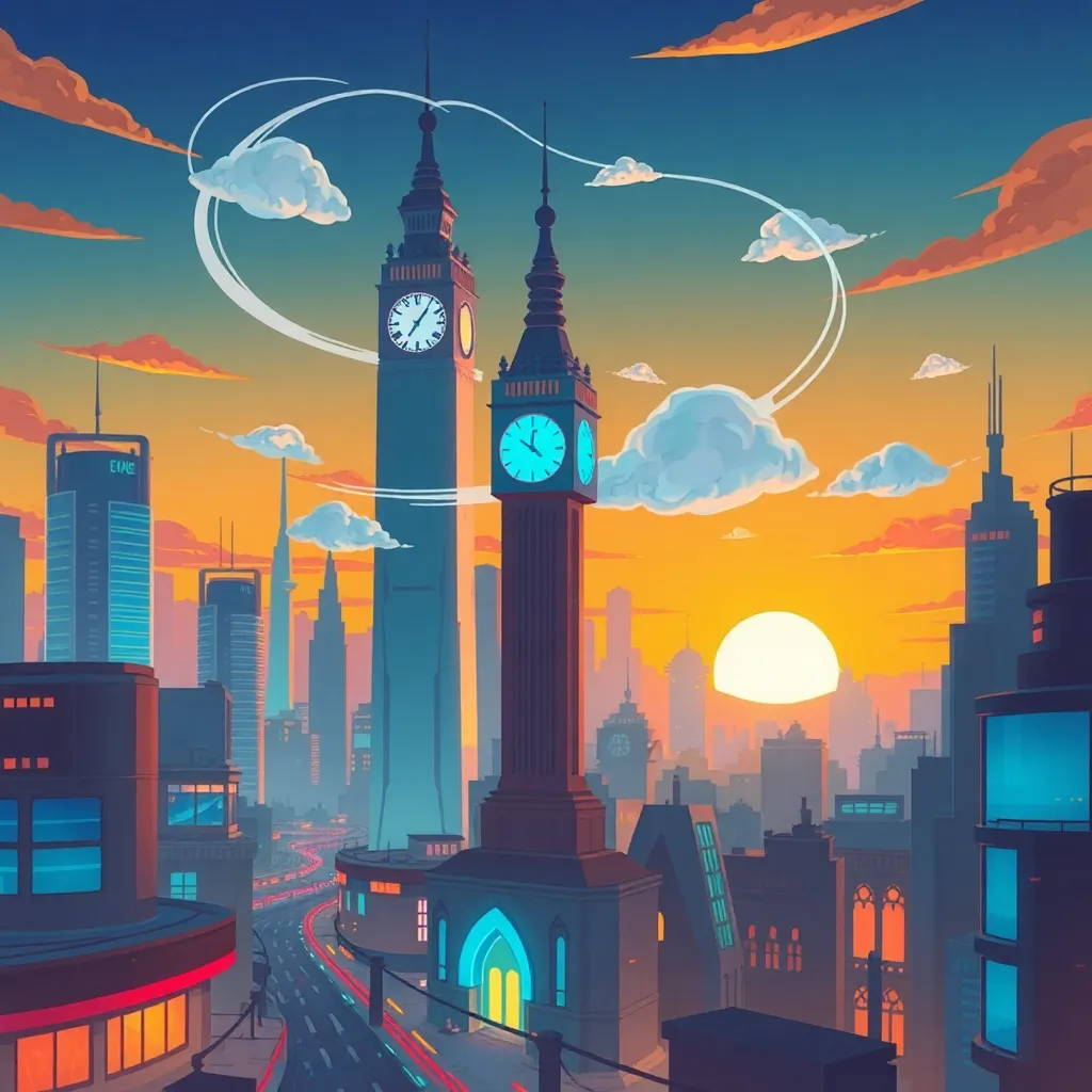 Create a whimsical illustration of a futuristic cityscape at sunset, with towering skyscrapers and neon-lit streets. Incorporate a prominent clock tower with a glowing blue face, surrounded by floating clouds and wispy contrails. The atmosphere should be warm and vibrant, with a hint of magic in the air.