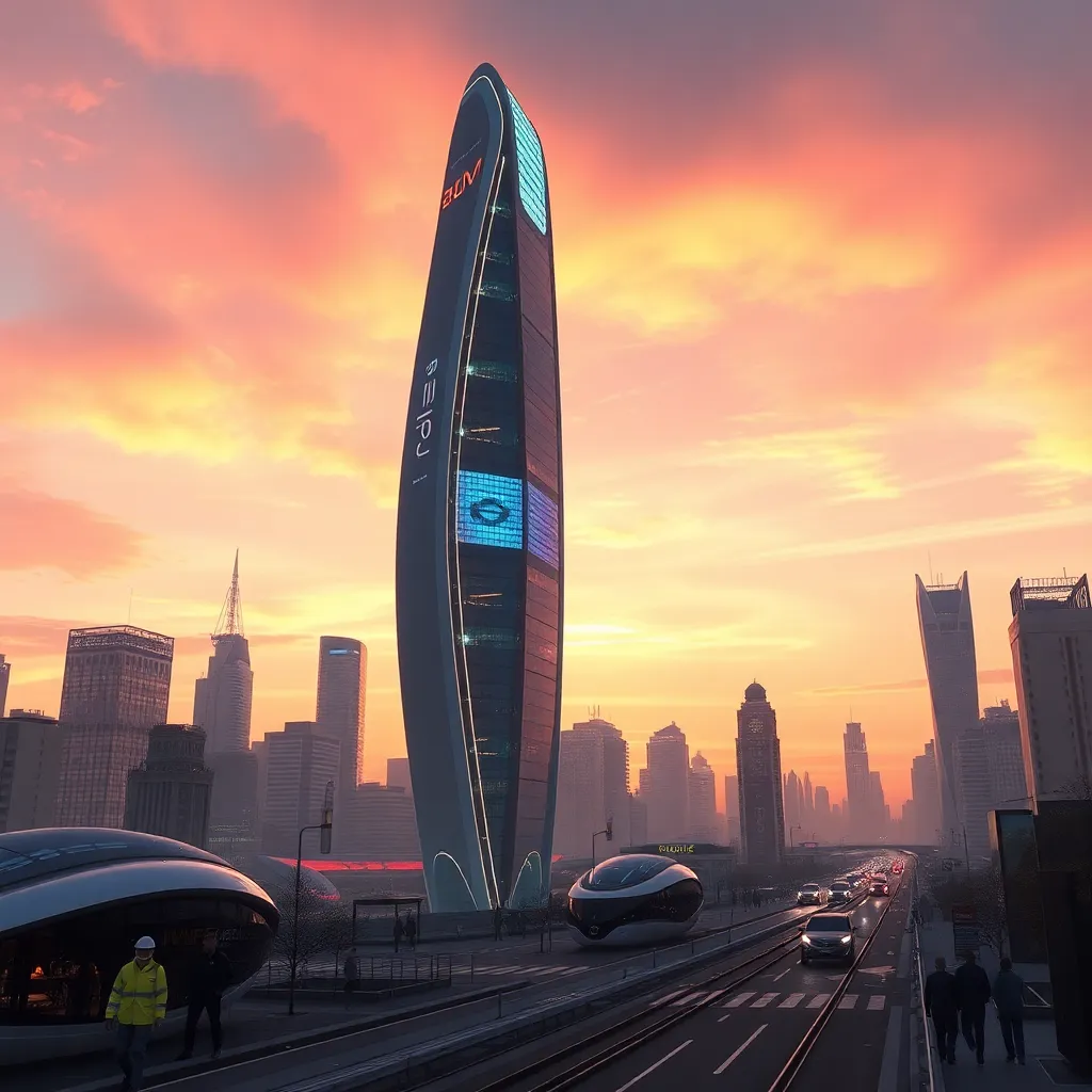 Create a futuristic cityscape at sunset with a sleek, high-tech skyscraper in the foreground. The building should have a futuristic, curved design with neon lights and a large digital display on the side. The surrounding city should be bustling with futuristic cars and pedestrians. The sky should be a warm orange and pink hue.