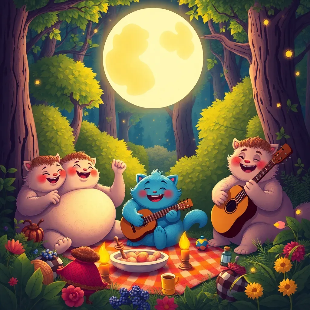 Create a vibrant and whimsical illustration of a fantastical forest, featuring a group of smiling, rotund creatures (think cartoonish, happy, and furry) playing instruments, dancing, and having a joyful picnic under a bright full moon. Incorporate lush greenery, twinkling fireflies, and a subtle hint of magic.