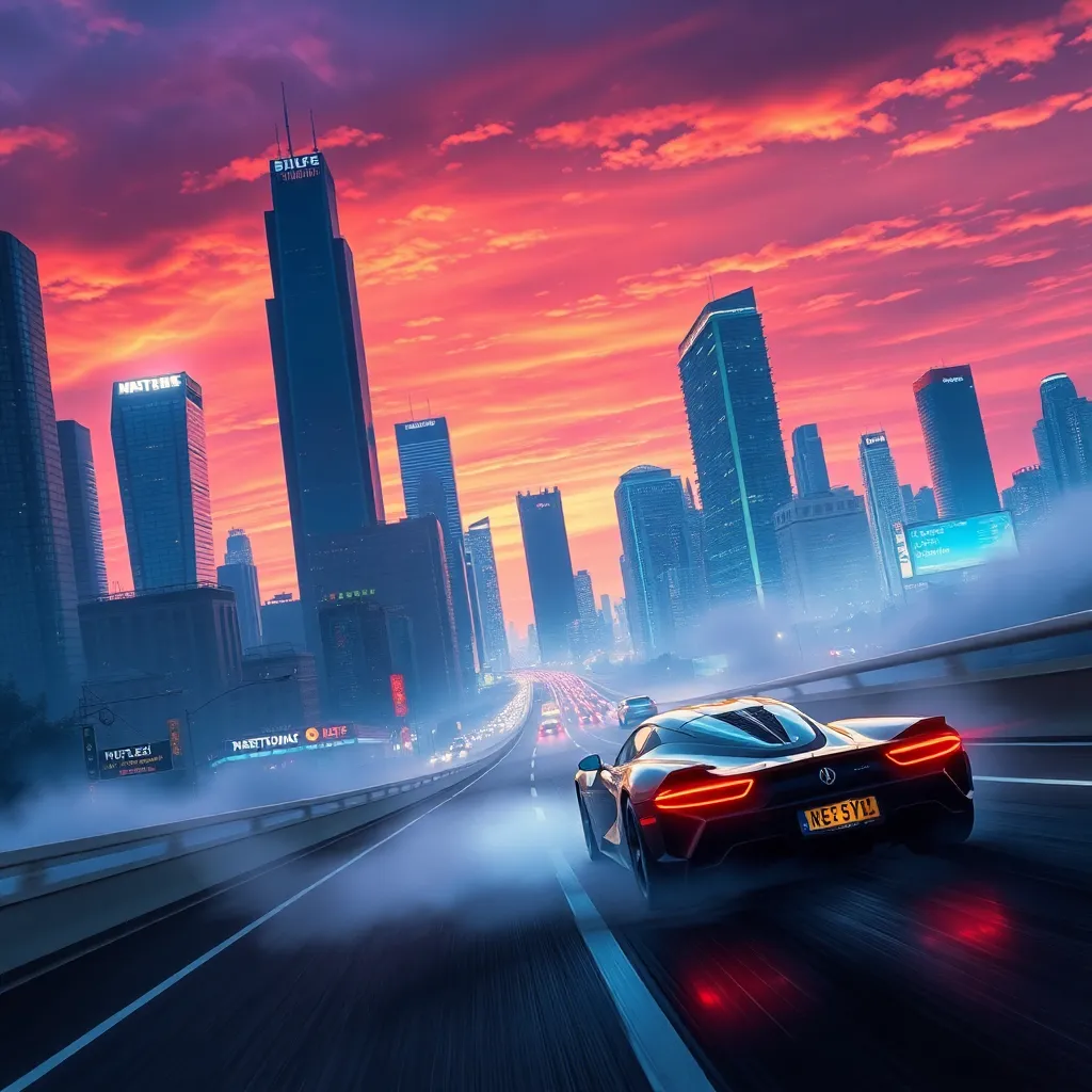 Create a futuristic cityscape at sunset, with towering skyscrapers and neon-lit streets. Incorporate a sleek, high-tech sports car zooming down the highway, surrounded by a haze of smog and pollution. The sky is ablaze with vibrant oranges and purples, and the atmosphere is electric with energy and excitement.