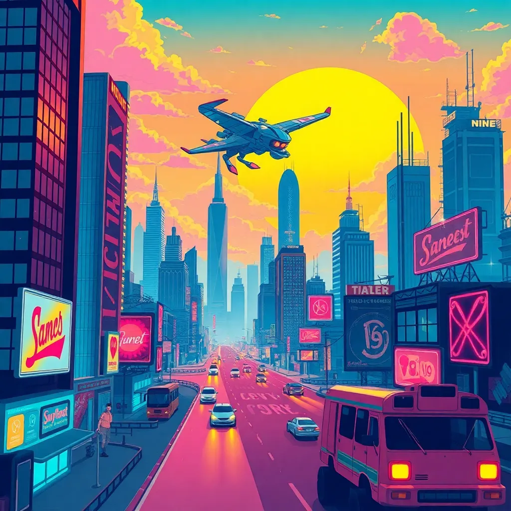 Create a vibrant and playful illustration of a futuristic cityscape at sunset. The scene should feature a mix of sleek skyscrapers, neon-lit billboards, and retro-futuristic vehicles. Incorporate whimsical elements like floating clouds, sparkling lights, and a majestic flying robot soaring above the city. Use bold colors and textures.