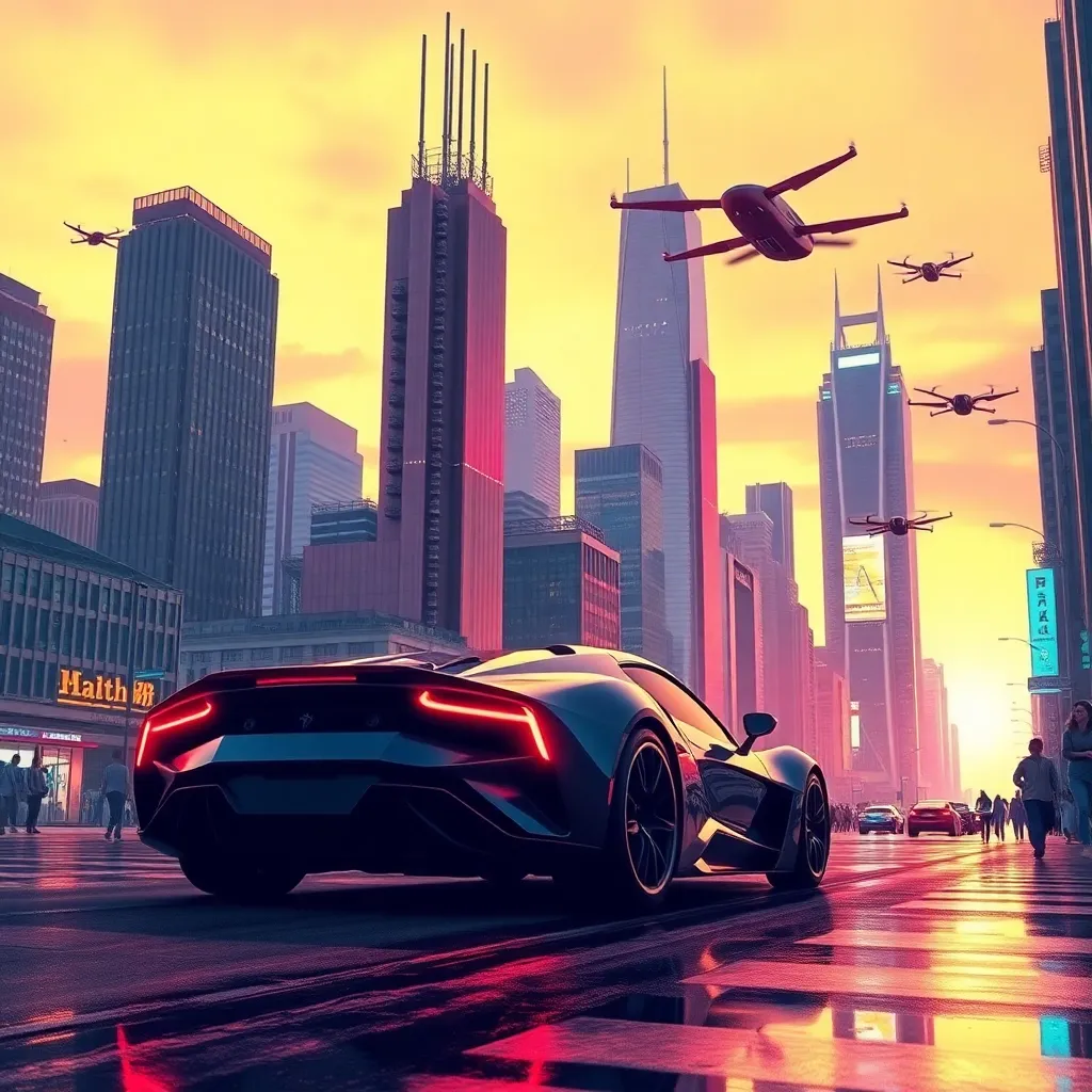 Create a futuristic cityscape at sunset, with towering skyscrapers and neon lights reflecting off the wet pavement. Incorporate a sleek, high-tech sports car driving down the main street, surrounded by bustling pedestrians and flying drones. The sky should be a warm orange-yellow hue, with a hint of pink and purple.