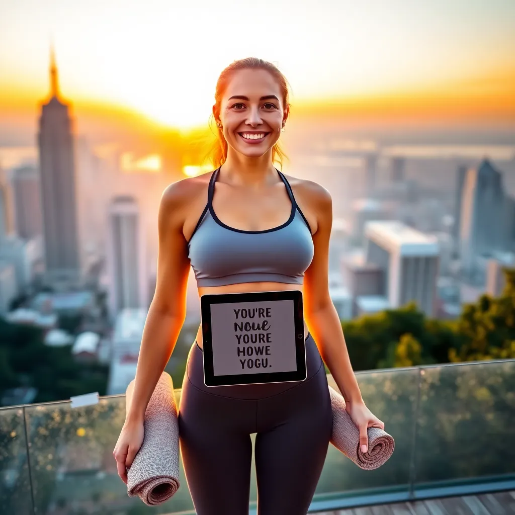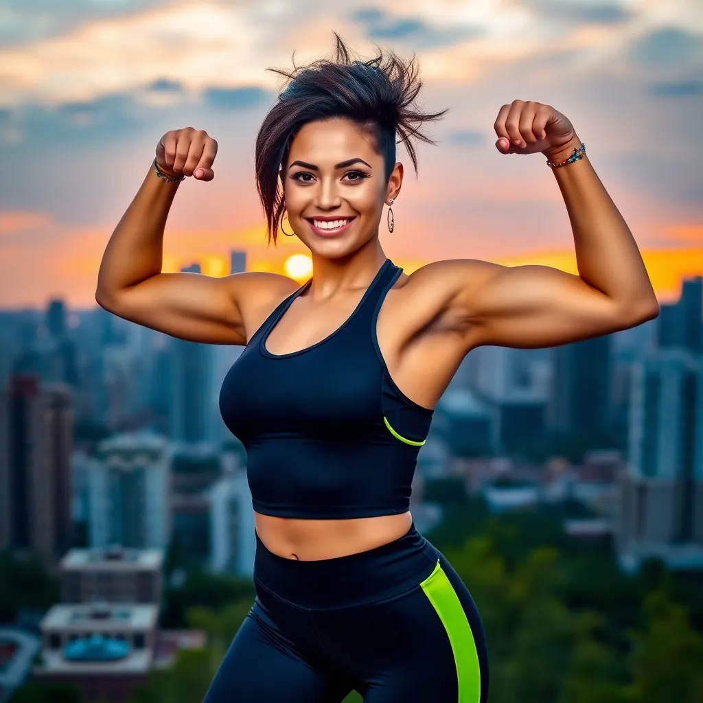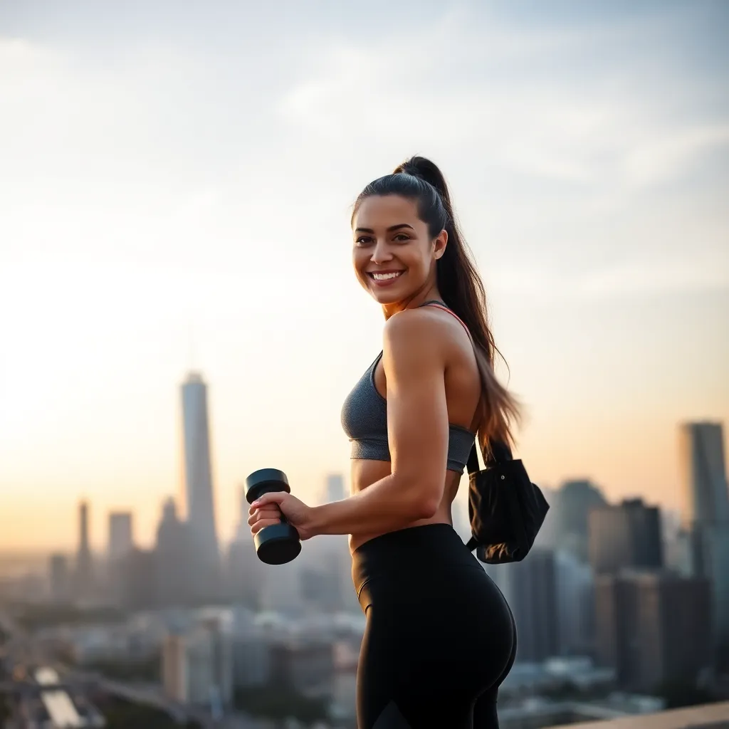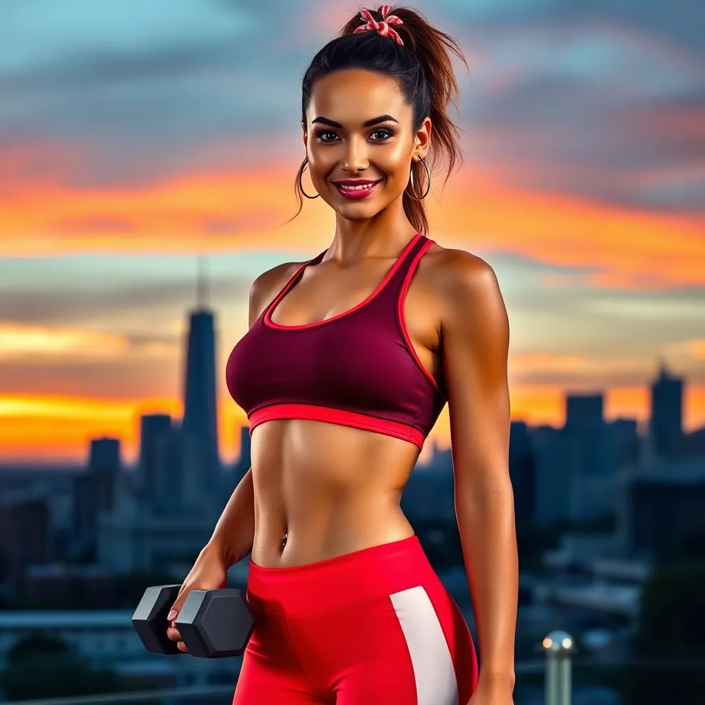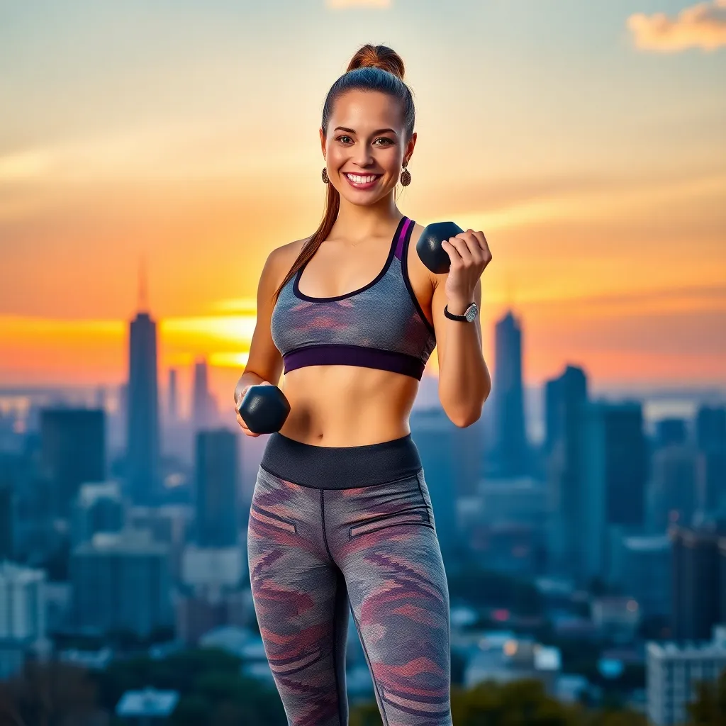 Create an AI-generated image of a fit and fierce fitness influencer, standing in front of a city skyline at sunset, wearing a bold workout outfit and holding a dumbbell. The influencer should have a strong and confident expression, with a subtle smile and a hint of sweat. The image should exude motivation and empowerment.