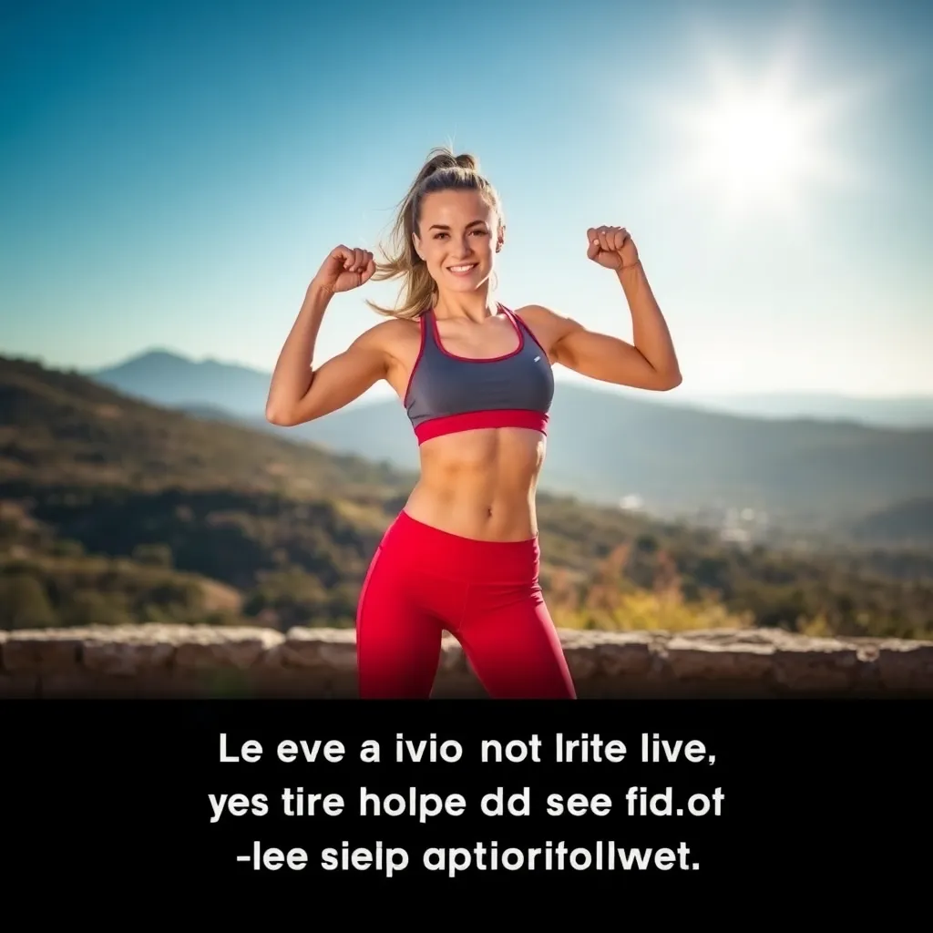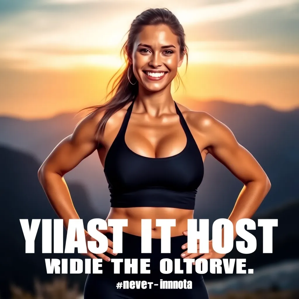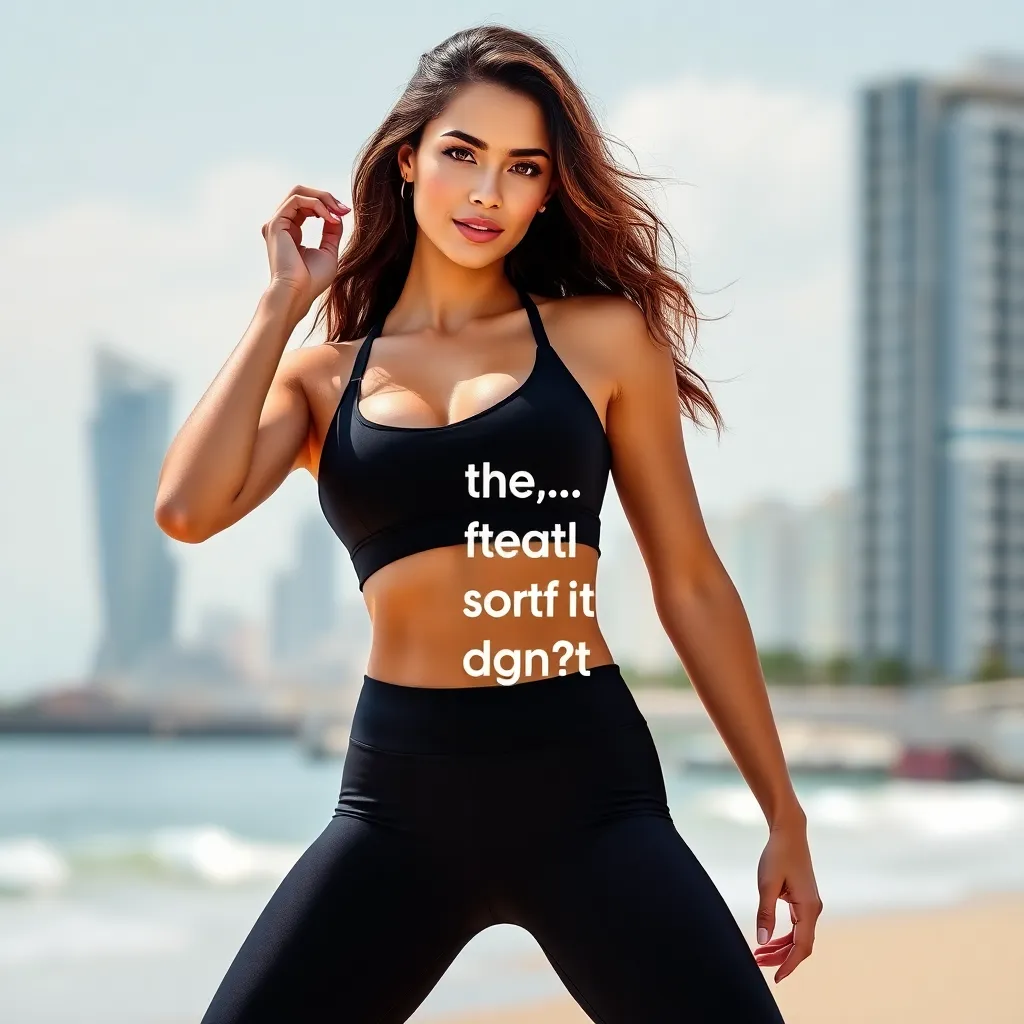 Create a stunning AI-generated image of a fit and radiant fitness influencer, dressed in a sleek black sports bra and leggings, posing in a bold and dynamic pose, with a cityscape or beach background. Incorporate a motivational quote on the image to inspire her followers to reach their fitness goals.