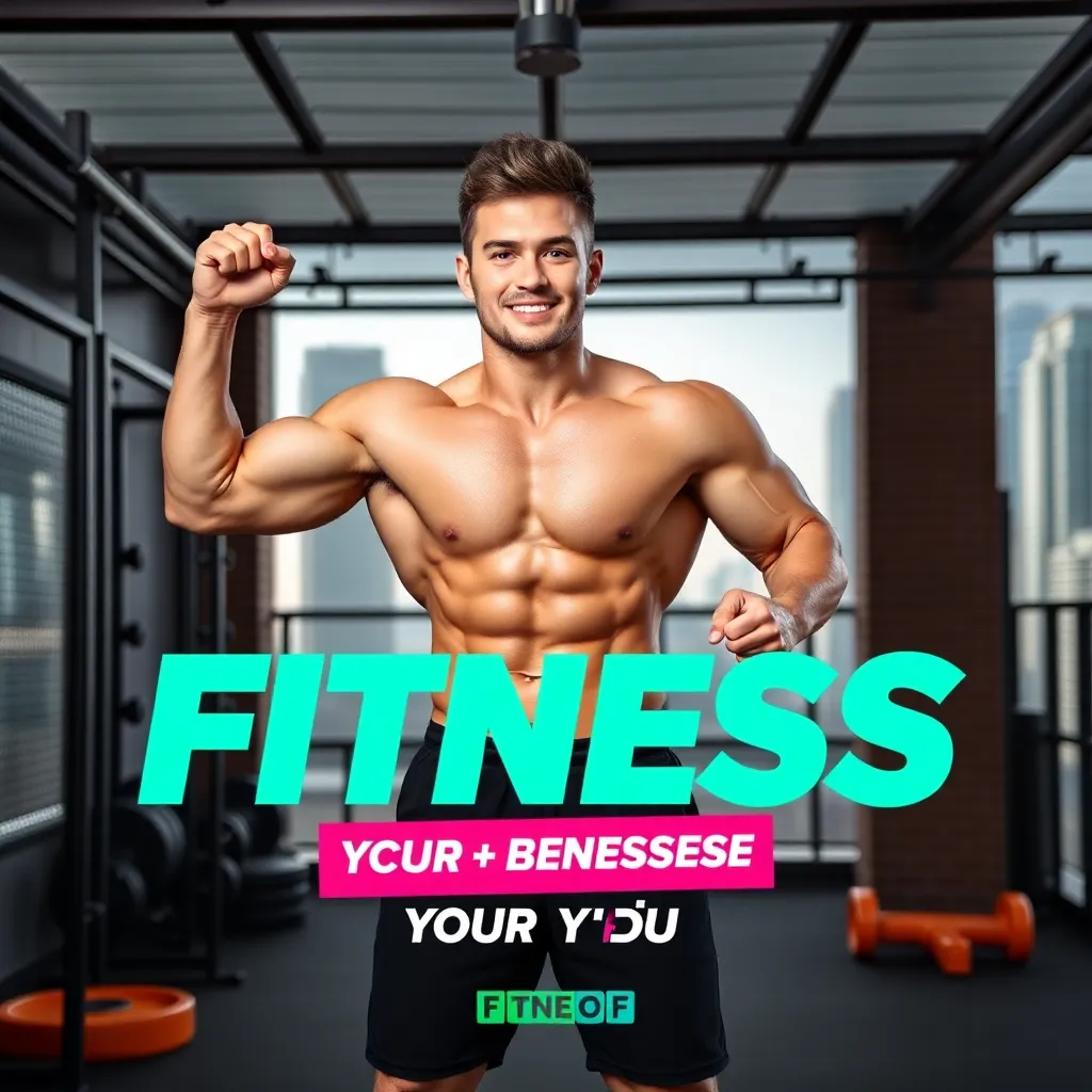 Create an energetic and motivational image for a fitness influencer showcasing a strong and toned physique. The scene should be set in a trendy outdoor gym with a cityscape background. Incorporate vibrant colors, bold typography, and a motivational quote to inspire followers to reach their fitness goals.