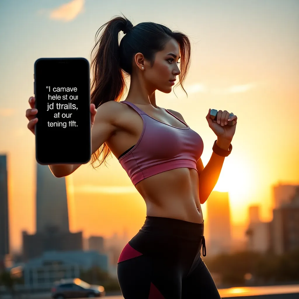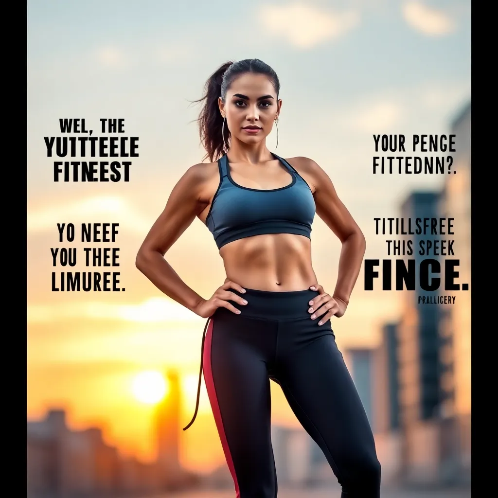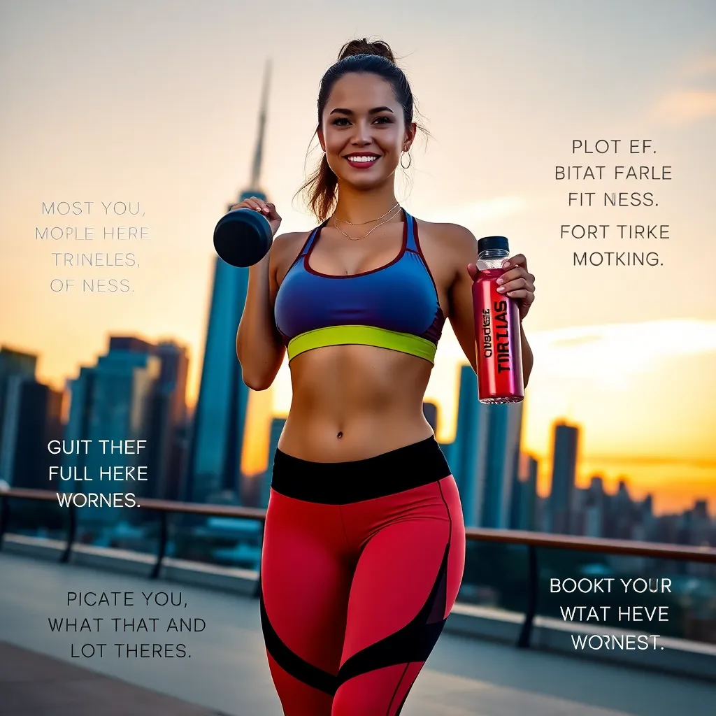 Capture the essence of a fit and fierce fitness influencer! Imagine a strong and toned woman standing in a dynamic pose, surrounded by motivational quotes and sports equipment. She's wearing a trendy sports bra and leggings, with a determined expression on her face. The background is a blurred cityscape at sunset.