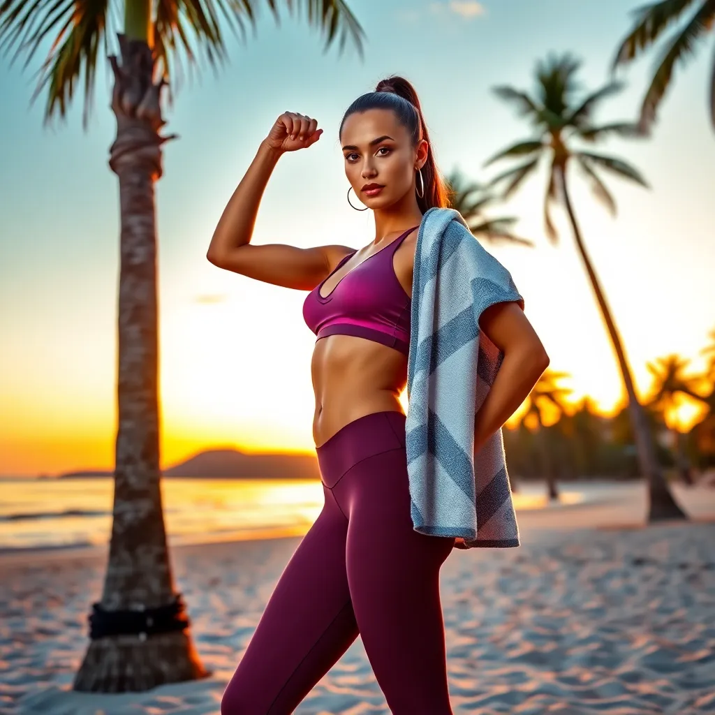 Create an AI-generated image of a fitness influencer posing on a scenic beach, surrounded by palm trees and a vibrant sunset. She's wearing a sleek sports bra and leggings, with a determined expression and a beach towel wrapped around her shoulders. Incorporate a subtle gradient effect to capture the warm glow of the setting sun.