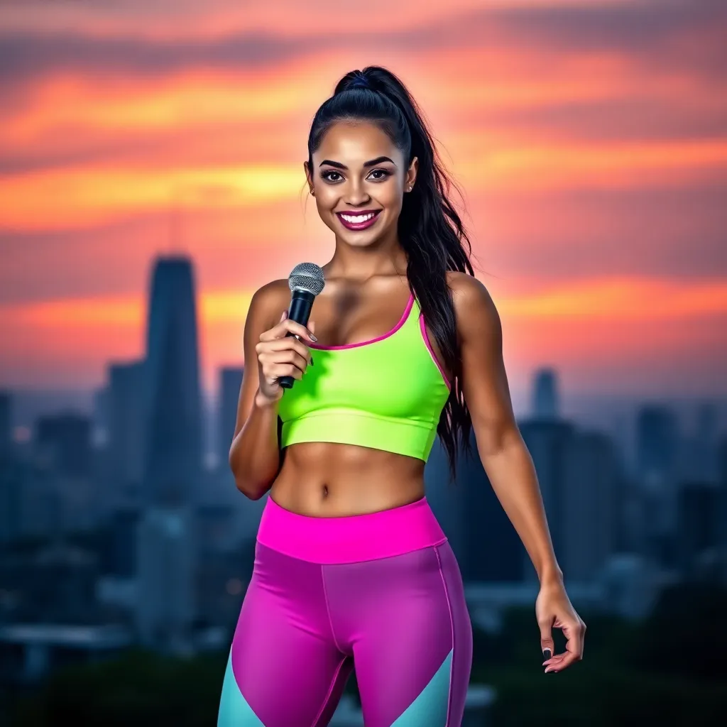 Create an AI-generated image of a fit and fierce female fitness influencer, standing in a dynamic pose in front of a city skyline at sunset. She's wearing a bold, neon green sports bra and matching leggings, with a confident smile and a microphone in hand, inspiring her followers to take control of their fitness journey.