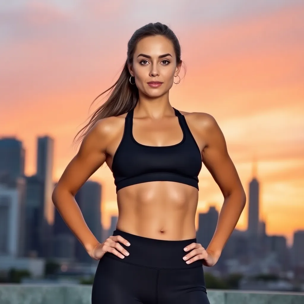 Create an Instagram-worthy image for a fitness influencer showcasing a strong and toned physique. The influencer is a 28-year-old female, standing in front of a city skyline at sunset, wearing a sleek black sports bra and high-waisted leggings, with a confident and determined expression on her face.