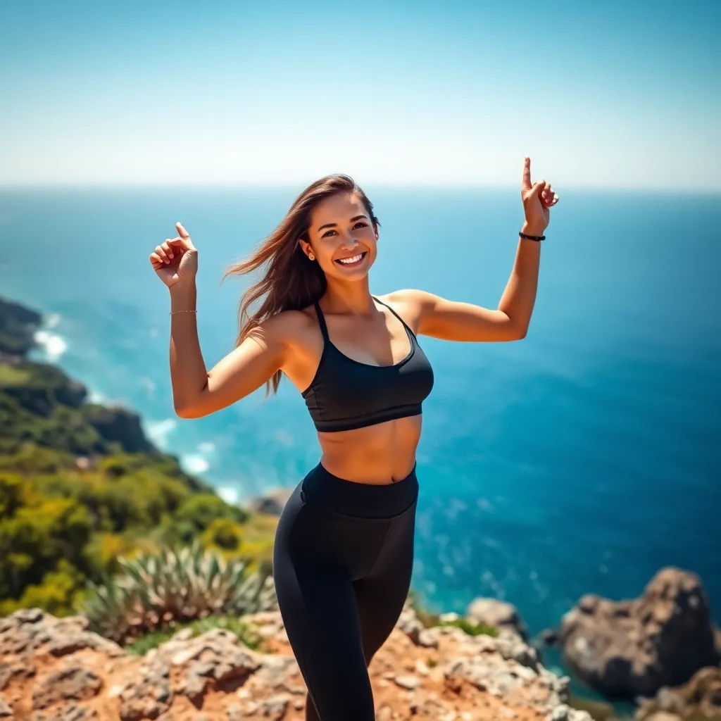 Create an AI-generated image of a fit and fierce fitness influencer, posing on a sunny beach with a toned physique, vibrant hair, and a radiant smile. She's wearing a sleek black sports bra, high-waisted leggings, and trendy sunglasses. Incorporate a motivational quote on a beach towel or nearby palm tree.