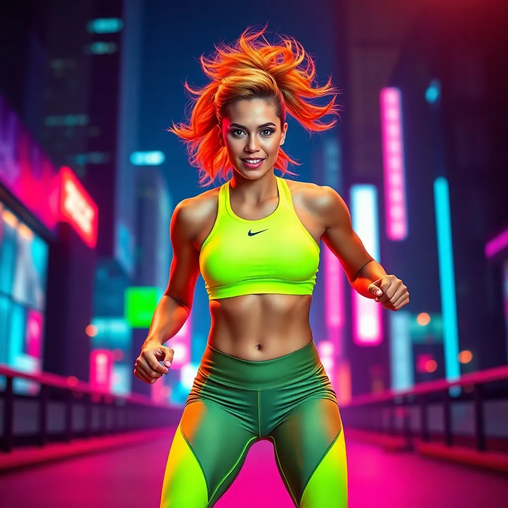 Capture the essence of a high-energy fitness influencer in motion! Imagine a dynamic figure, mid-workout, surrounded by bold neon lights and a cityscape backdrop. They're wearing a sleek, neon-green sports bra and matching leggings, with a determined expression and a bold, fiery hairstyle. The atmosphere is electric and empowering.