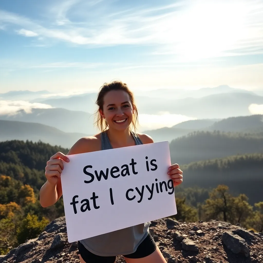 Capture the essence of a stunning summer morning as a fitness influencer stands victorious at the summit of a scenic hike. With sweat-drenched hair and a radiant smile, she proudly holds up a motivational sign that reads 'Sweat is fat crying' against a breathtaking backdrop of misty mountains and sun-kissed trees.