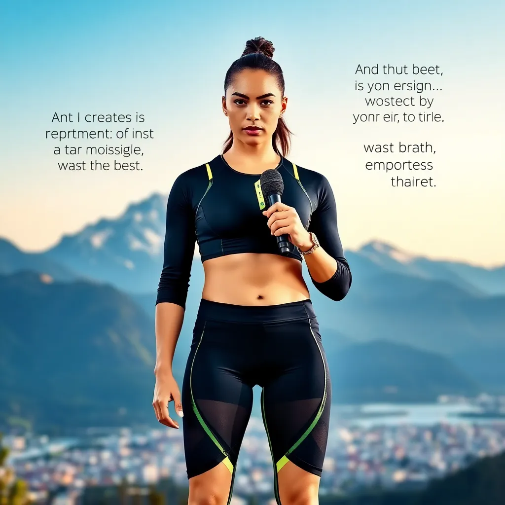 Create an AI image of a fitness influencer standing in front of a picturesque mountain range, wearing a sleek black and neon green athletic outfit, with a determined expression and a microphone in hand, surrounded by motivational quotes and a subtle cityscape in the background, conveying a sense of empowerment and motivation.