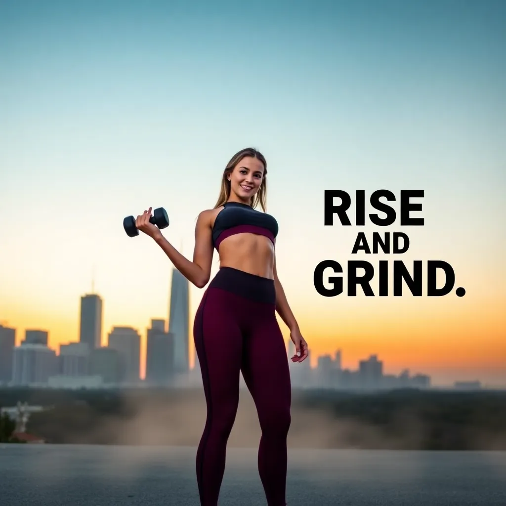 Create an image of a fitness influencer, 'SweatSara', standing in front of a city skyline at sunrise, wearing a sleek sports bra and leggings, holding a dumbbell and giving a confident pose. She's surrounded by a subtle haze of fog, with a motivational quote 'Rise and Grind' written in bold letters.