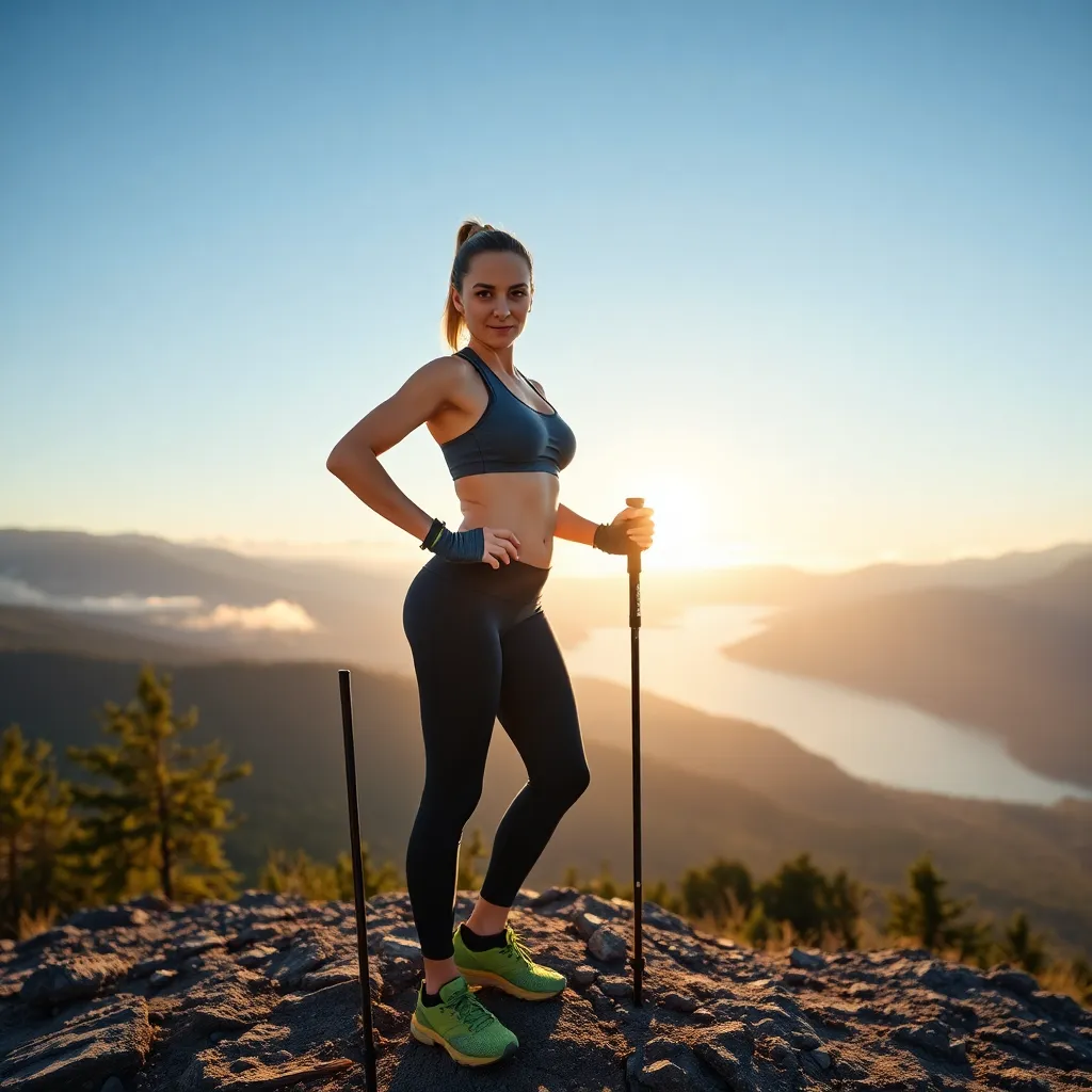 Create an empowering image of a fitness influencer standing confidently on a mountaintop at sunrise, wearing a bold sports bra and leggings, with a determined expression and a gloved hand grasping a hiking pole. The background features a breathtaking landscape with misty mountains and a serene lake in the distance.