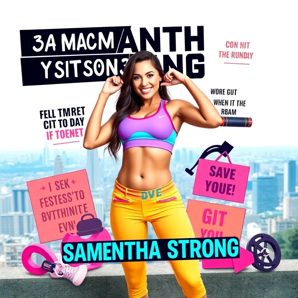 Create a vibrant and energetic image of a fitness influencer, 'Samantha Strong', posing in a bold and colorful outfit, surrounded by motivational quotes and fitness props, with a cityscape or nature background. The image should convey a sense of empowerment, motivation, and fun, with a mix of bold and pastel colors.