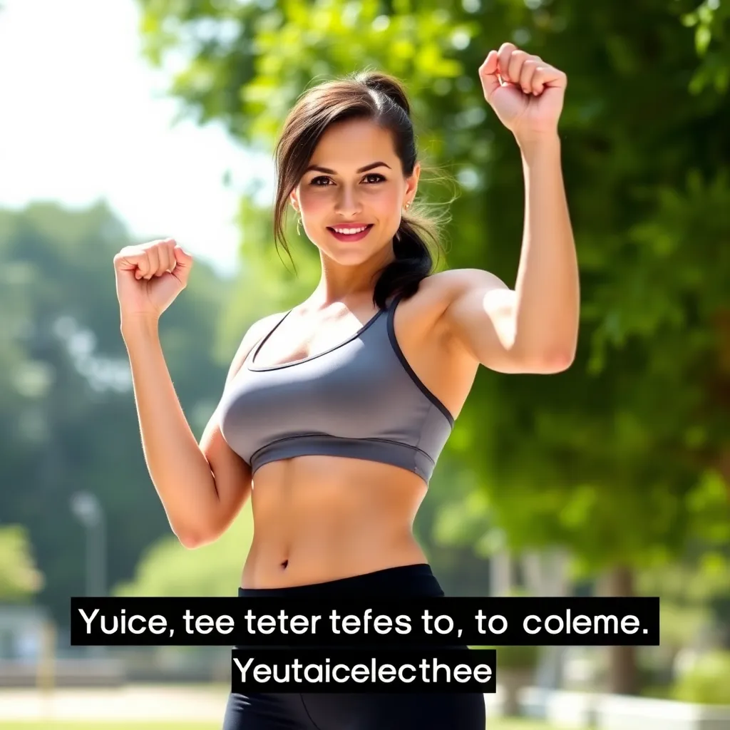 Capture the essence of a radiant fitness influencer, standing confidently in a sun-drenched outdoor setting, wearing a sleek athletic outfit and showcasing toned muscles. Hair is styled in a sleek ponytail, and a bright smile radiates confidence. Background features lush greenery and a cityscape in the distance.