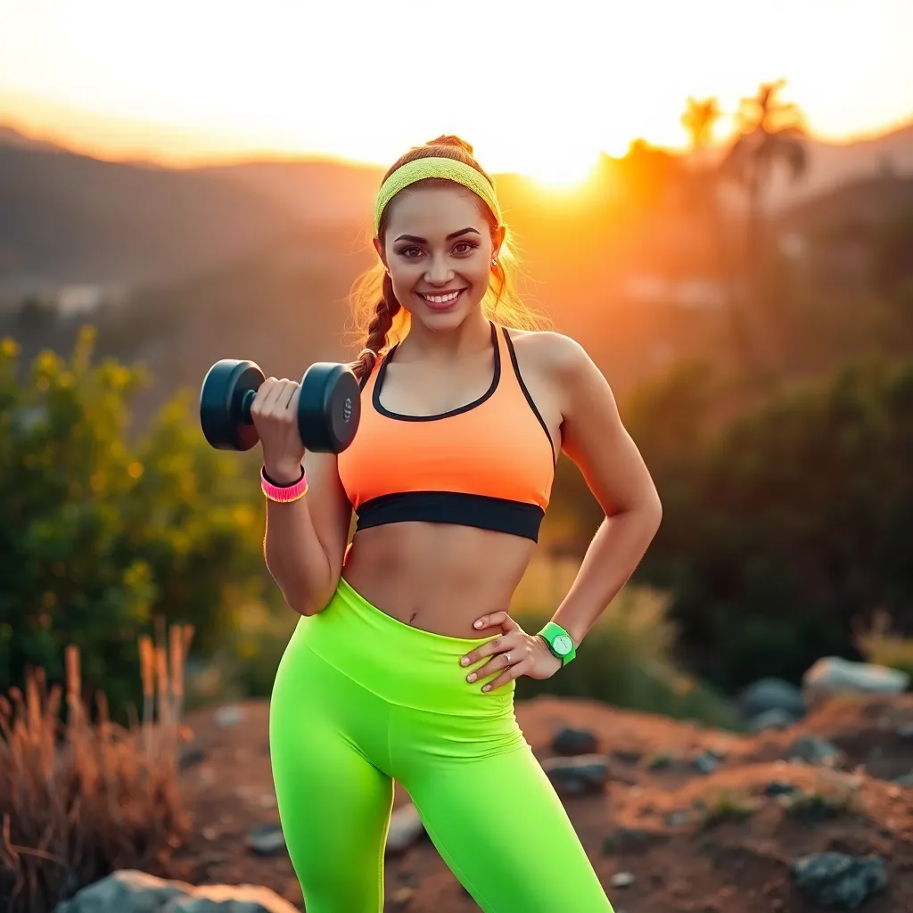 Create a visually stunning image of a fit and fierce fitness influencer posing confidently on a scenic outdoor backdrop, surrounded by lush greenery and a warm sunset glow. Incorporate bold, neon-colored activewear and accessories to make the image pop. The influencer should be holding a dumbbell and sporting a radiant smile.