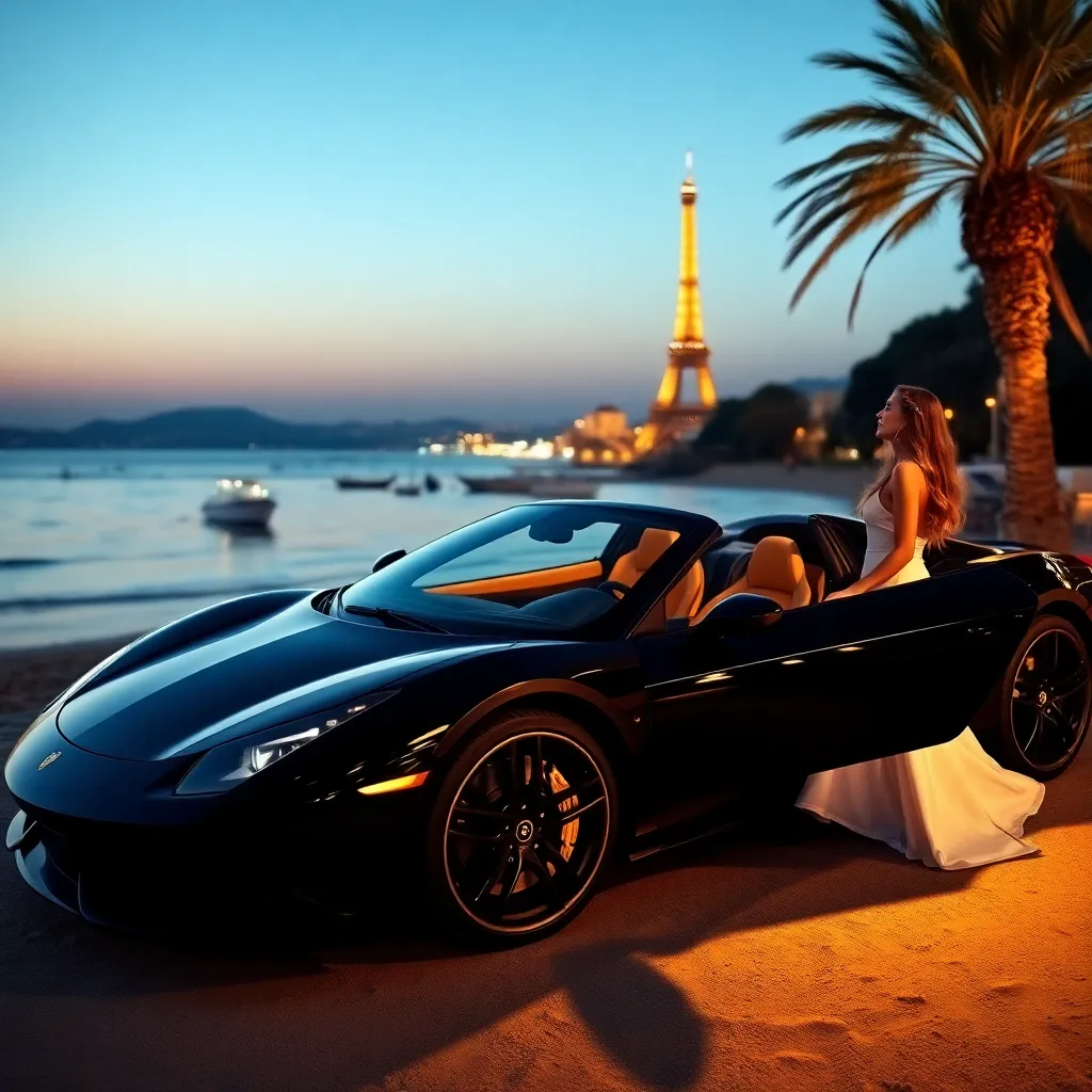 Envision a stunning summer evening in the French Riviera. A sleek, black sports car is parked on the edge of a glittering Mediterranean beach, with the Eiffel Tower shining in the distance. A glamorous woman, dressed in a flowing white evening gown, steps out of the car and onto the sand, her long hair blowing in the breeze.