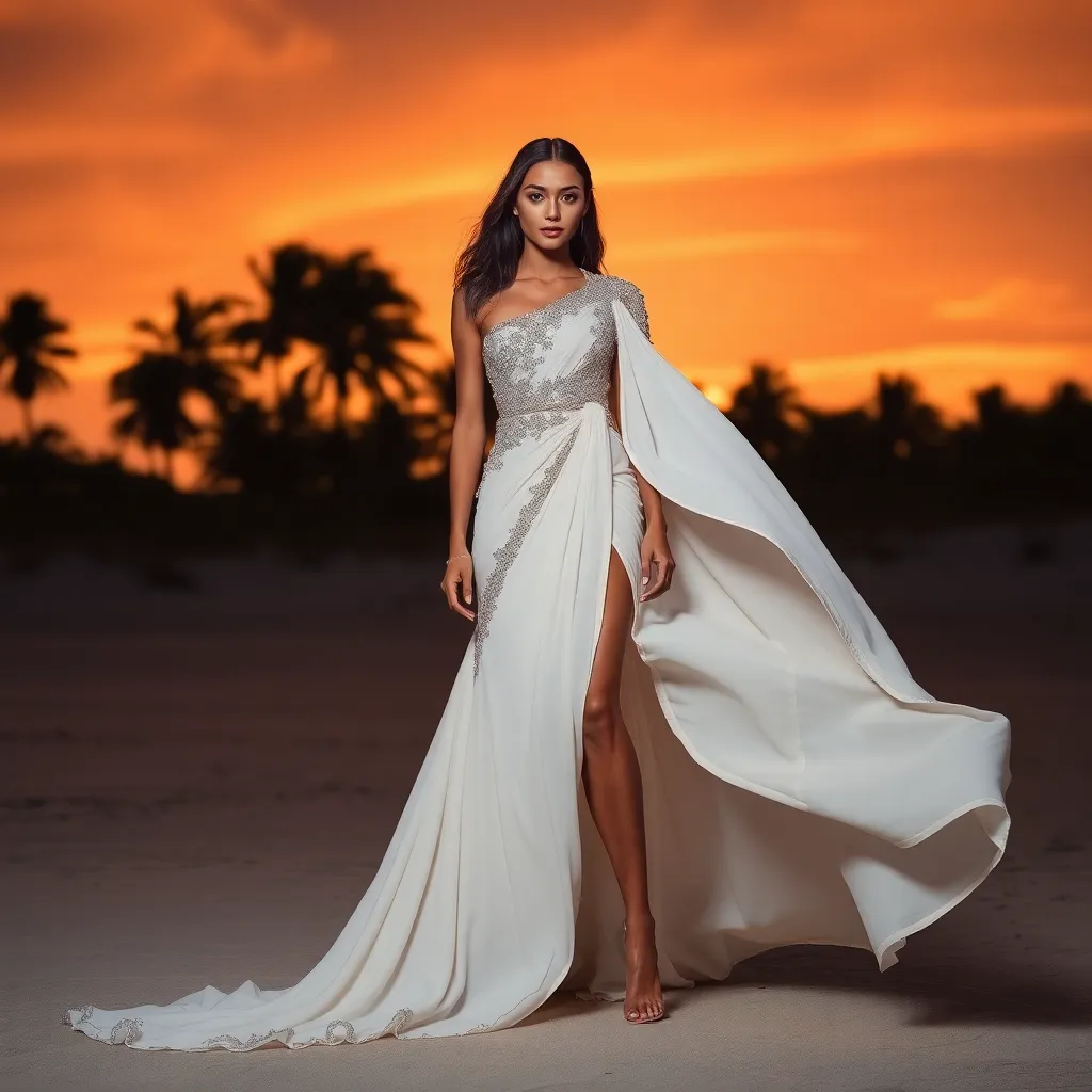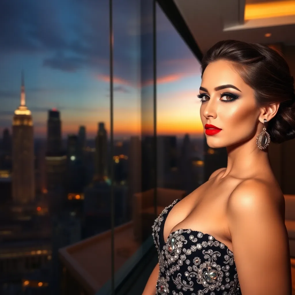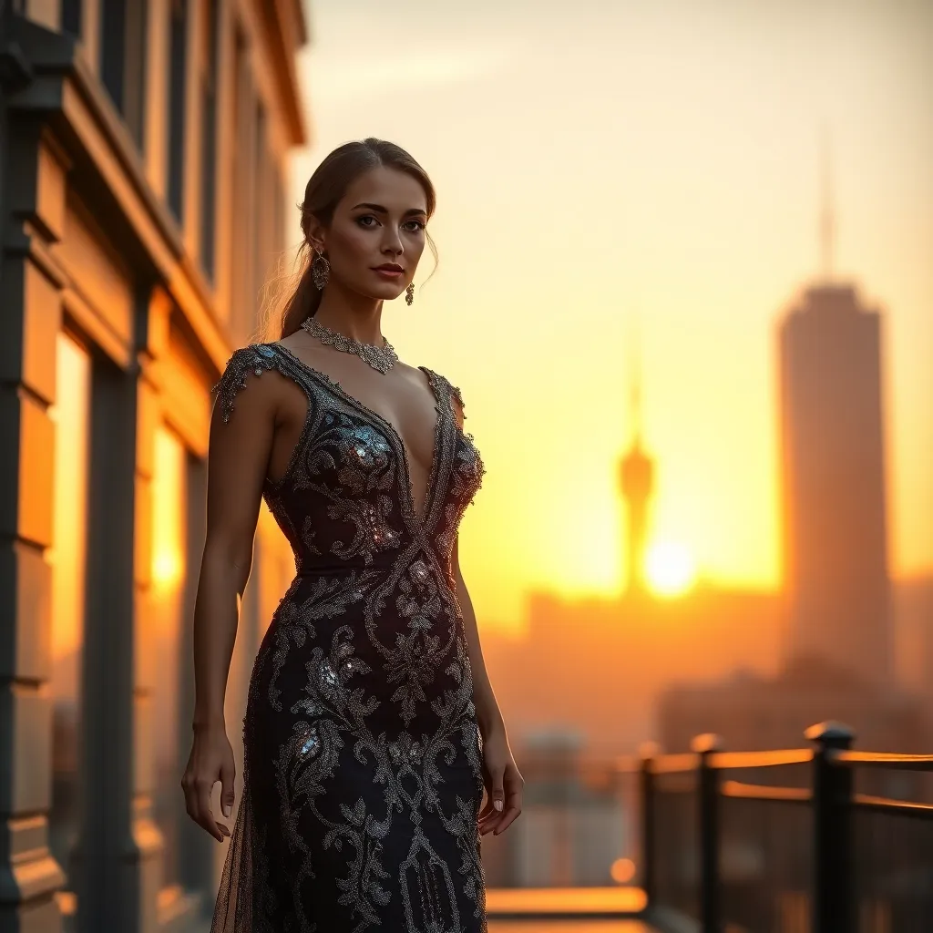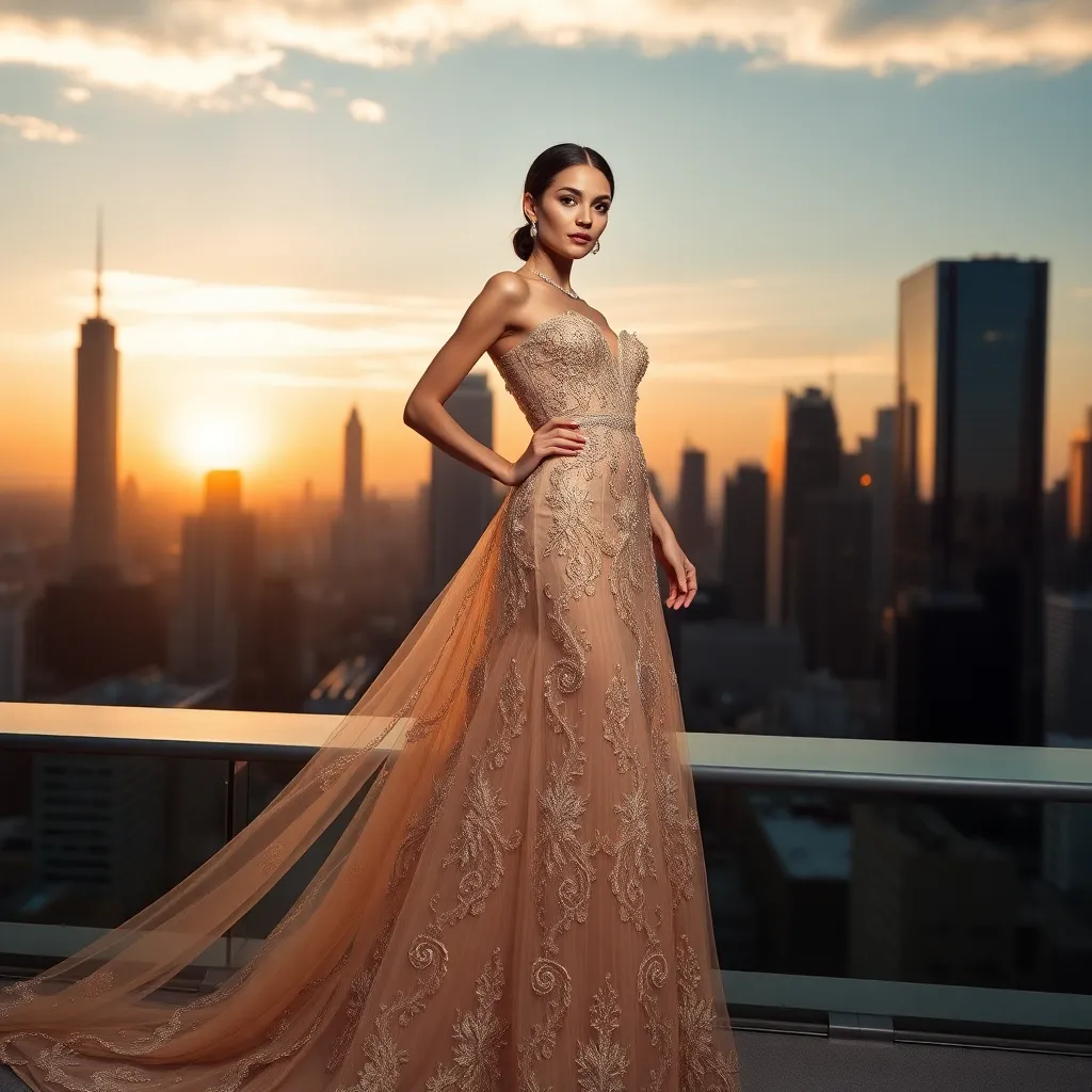 Create an image for a luxurious, high-end fashion editorial for Glamour magazine. Imagine a stunning model, dressed in a bespoke, champagne-hued evening gown, posing against a backdrop of gleaming city skyscrapers at sunset. The dress is adorned with intricate, hand-beaded embroidery and a delicate train flows behind her.
