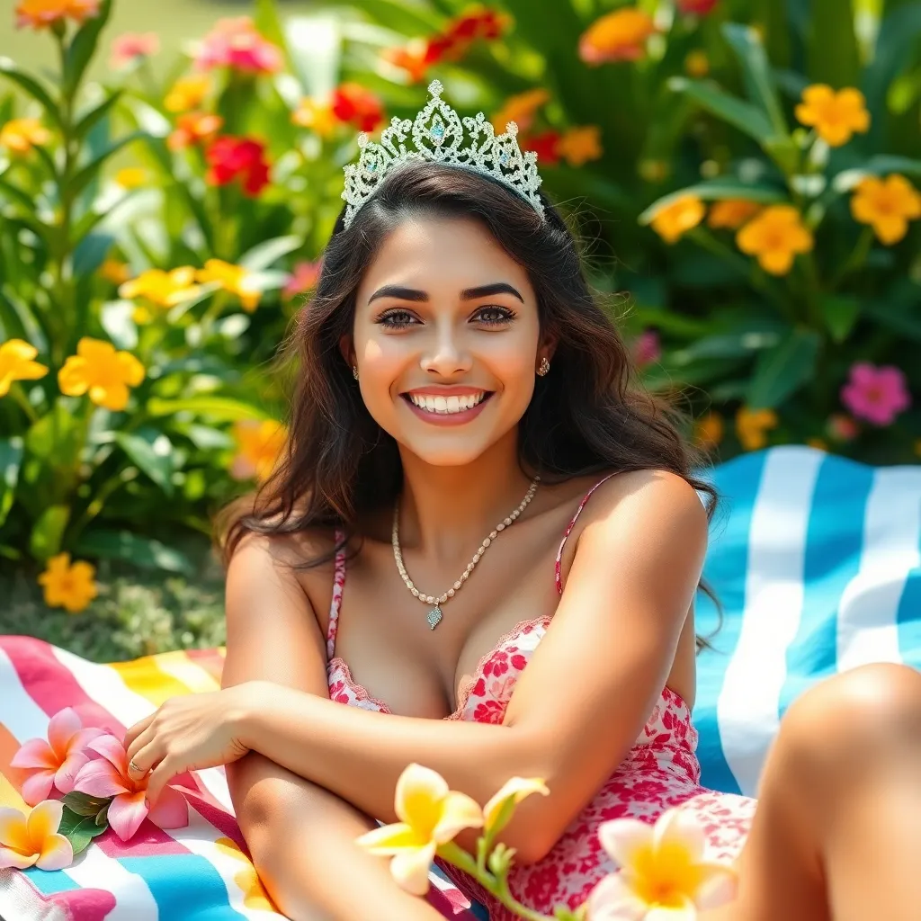 Create a stunning AI-generated image for Glamour's 'Summer Vibes' editorial. Imagine a young woman lounging on a colorful beach towel, surrounded by lush greenery and vibrant flowers. She's wearing a flowy, pastel pink dress with a matching wide-brimmed hat, and her hair is styled in effortless, beachy waves.