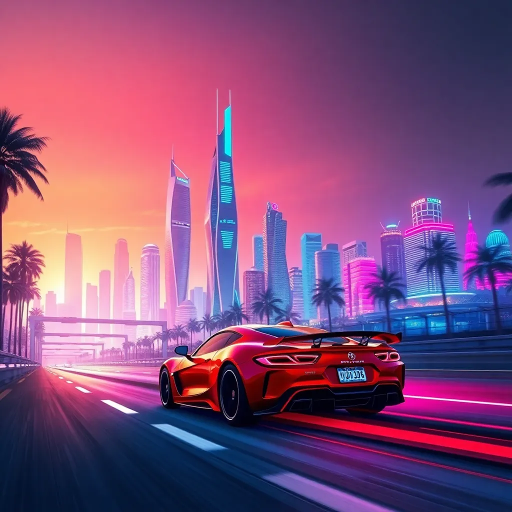 Create a stunning, futuristic cityscape at sunset, with sleek skyscrapers and neon lights reflecting off a futuristic highway. Incorporate a bold, red sports car speeding down the road, surrounded by towering palm trees and a vibrant, colorful atmosphere. The sky should be a warm, golden hue with a hint of pink.