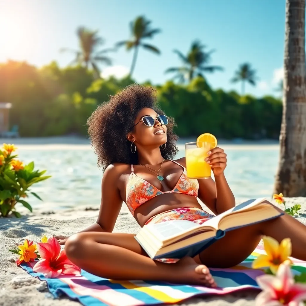 Create a stunning AI-generated image for Glamour magazine's summer issue. Depict a radiant, sun-kissed beauty lounging on a plush, white beach towel, surrounded by lush greenery and vibrant flowers. Her long, curly hair flows down her back as she gazes out at the turquoise ocean, with a refreshing cocktail in hand.