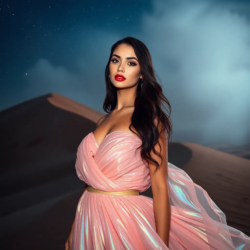 Create a stunning AI-generated image for Glamour's Spring Fashion issue. Imagine a model walking on a sun-kissed beach at sunset, wearing a flowing, pastel pink evening gown with intricate lace details and a delicate silver necklace. Capture the essence of elegance, sophistication, and carefree luxury in this captivating scene.