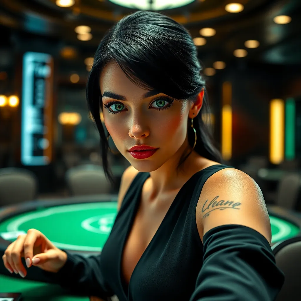 Create an AI-generated image of a stunning, modern-day Bond Girl, circa 2023. Imagine a sophisticated, high-stakes poker game in a luxurious, high-tech casino. Our heroine, 'Luna', is a brilliant mathematician and card shark, dressed in a sleek, black jumpsuit, with piercing green eyes and raven-black hair, exuding confidence and charm.