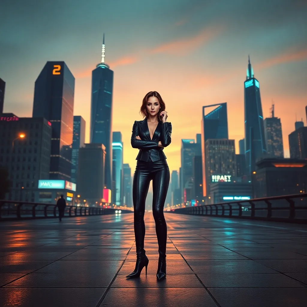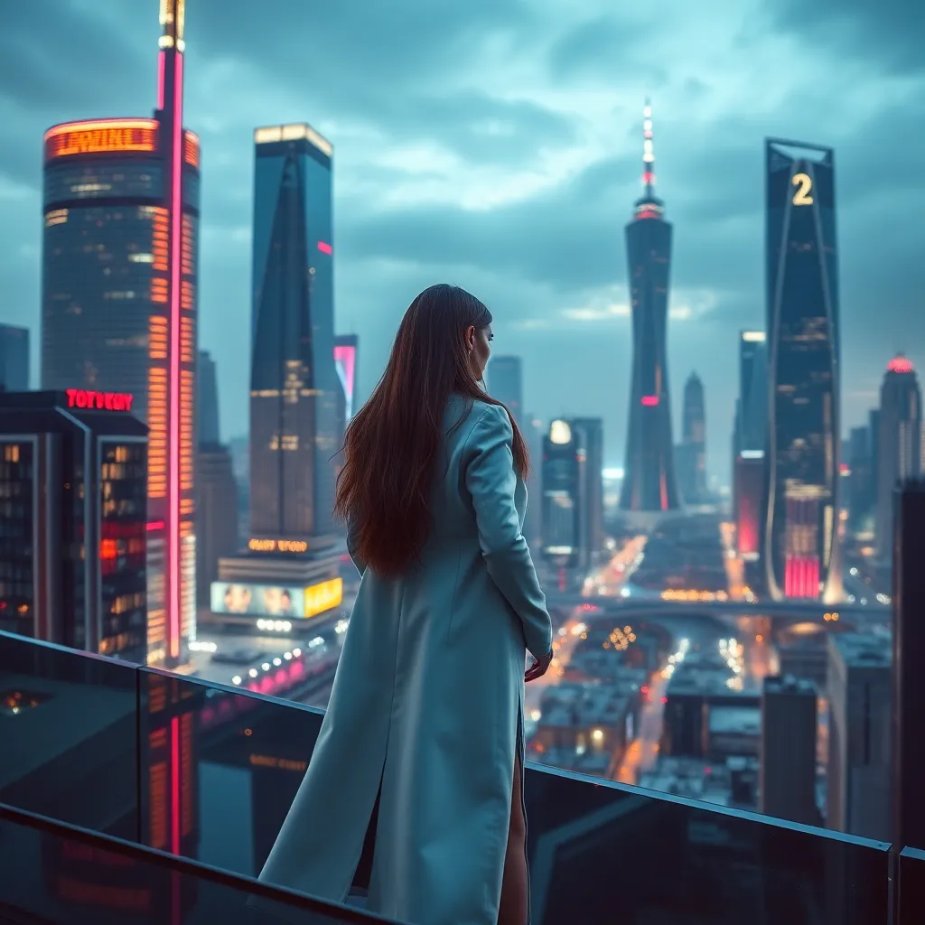Create a stunning, futuristic cityscape at dusk, with sleek skyscrapers and neon lights reflecting off the wet pavement. Incorporate a stylish, long-haired woman in a flowing white coat, standing confidently at the edge of the city, gazing out at the breathtaking view. The atmosphere should be chic and avant-garde.