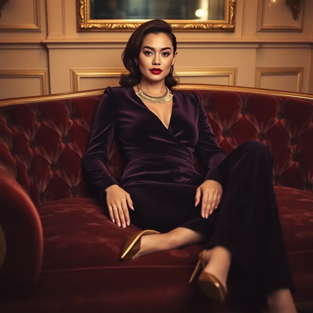 Create a stunning, high-fashion editorial image for Glamour magazine. Imagine a sophisticated, modern woman lounging on a luxurious velvet sofa, surrounded by lavish gold accents and soft, warm lighting. She's wearing a sleek, long-sleeved jumpsuit in a rich jewel tone, with a statement gold necklace and bold red lips.