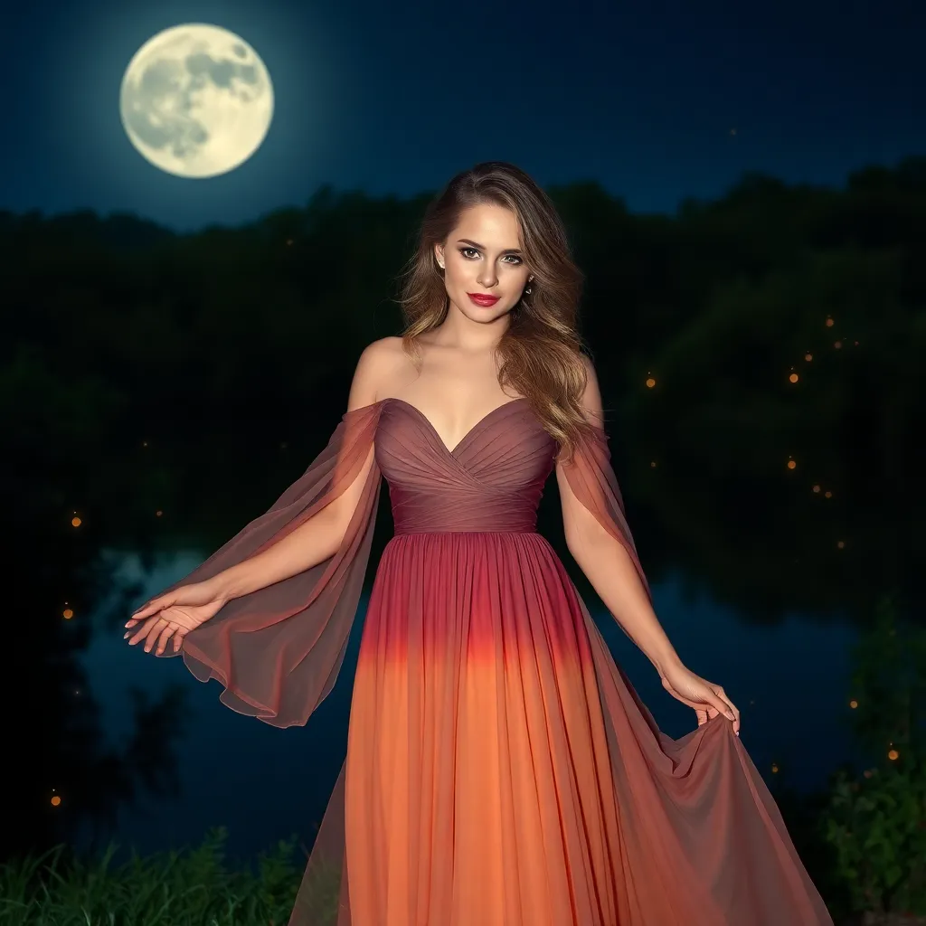 Envision a luxurious, moonlit garden party in the French Riviera. A stunning woman in a flowing, strapless gown stands amidst a sea of candles and twinkling stars. Her long, curly hair cascades down her back, and a champagne flute floats in her hand. Create an AI image that exudes sophistication and glamour.
