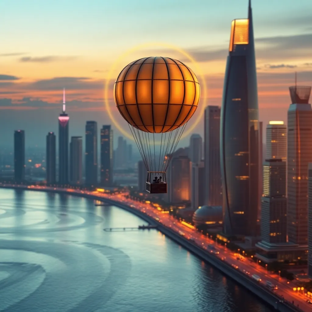 Create a stunning, futuristic cityscape at sunset, with sleek skyscrapers and neon lights reflecting off the water. Incorporate a vintage-inspired hot air balloon soaring above the city, surrounded by a halo of warm, golden light. The atmosphere should be dreamy and captivating, with a touch of whimsy.