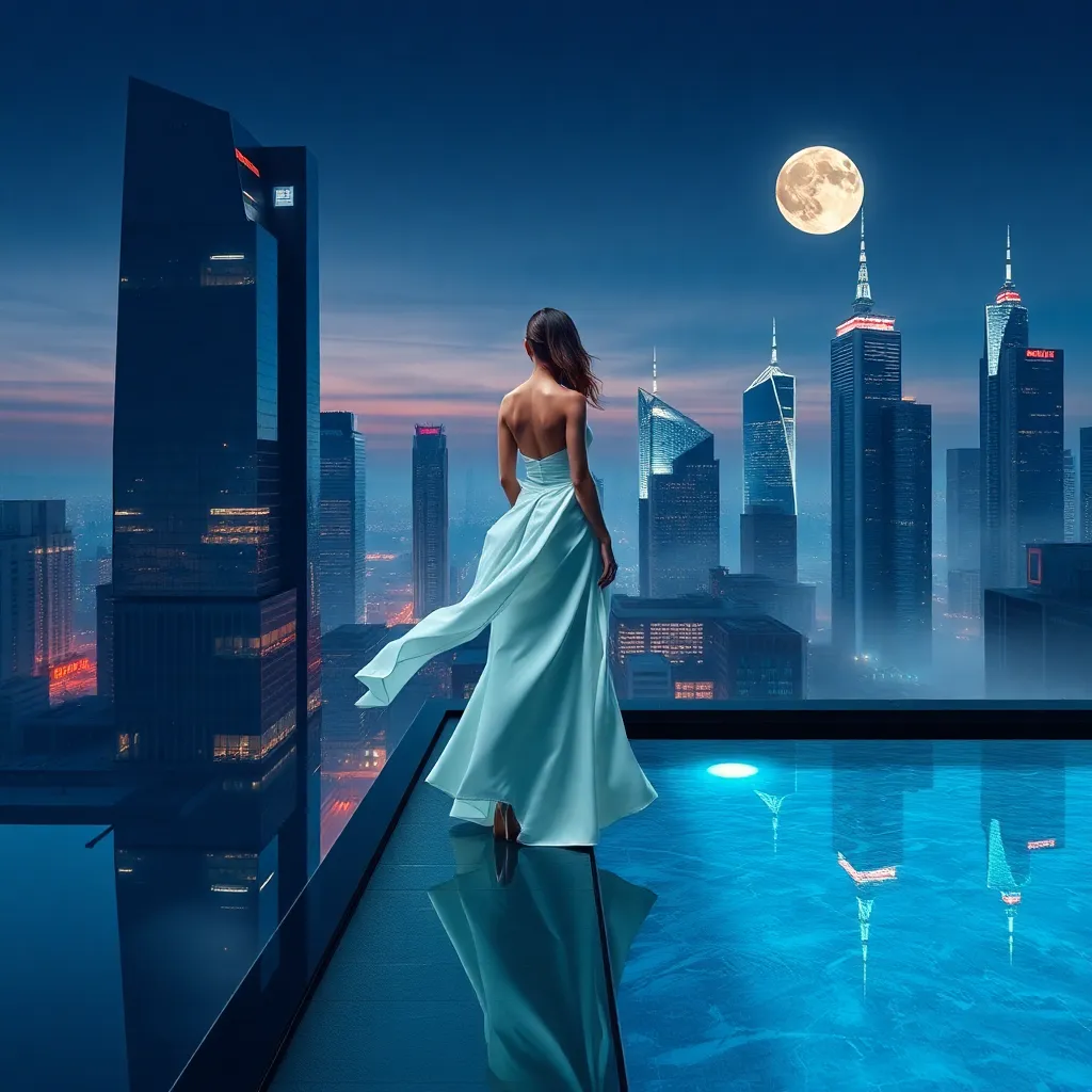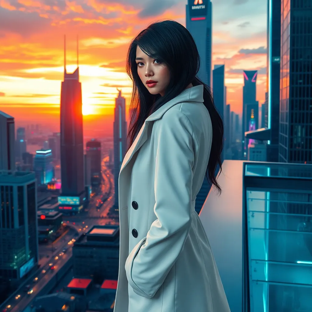 Envision a futuristic cityscape at sunset, with towering skyscrapers and sleek neon lights reflecting off the wet pavement. A stylish woman in a flowing white coat, with piercing green eyes and raven-black hair, stands at the edge of the rooftop, gazing out at the breathtaking view with a hint of mystery.