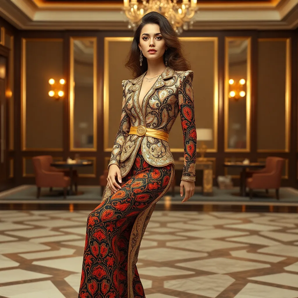 Create an AI-generated image for a luxury fashion editorial in Glamour magazine. The image should feature a stunning model posing in a lavish, high-end setting. The model should be wearing a bespoke, high-fashion outfit with intricate details and bold colors. The background should be a sophisticated, upscale environment with subtle textures and patterns.