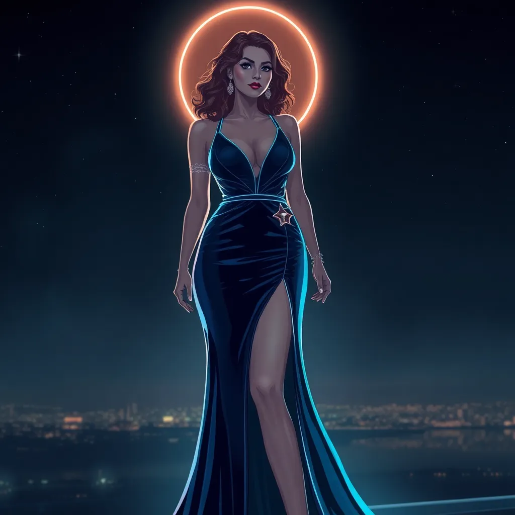 Create a futuristic, high-fashion editorial image for Glamour magazine. Imagine a bold, daring woman in a sleek, metallic jumpsuit, surrounded by a halo of light. Her long, curly hair is styled in a dramatic updo, and her eyes are lined with a striking, silver cat-eye. The background is a dark, gradient blue.