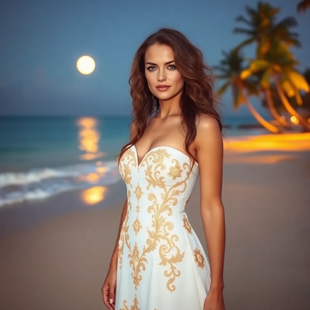 Create a captivating AI-generated image for Glamour magazine's summer issue. Envision a stunning woman lounging on a picturesque beach at sunset, surrounded by lush palm trees and a serene ocean backdrop. Her golden locks cascade down her back as she gazes out at the horizon, radiating confidence and beauty.