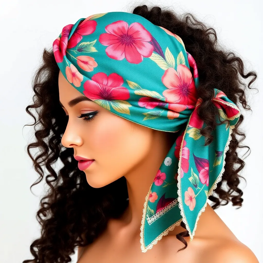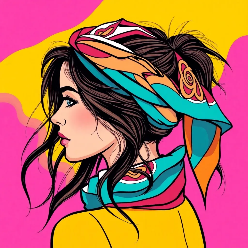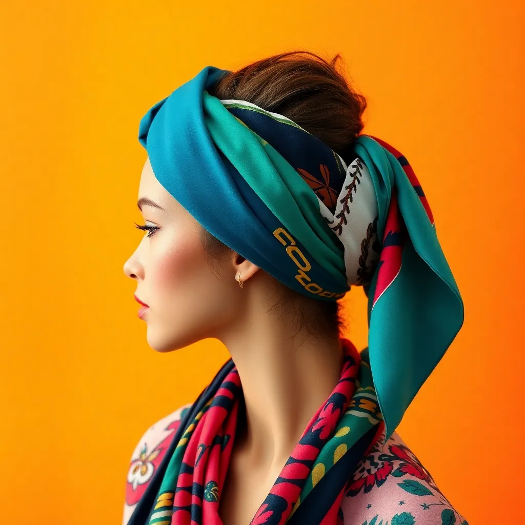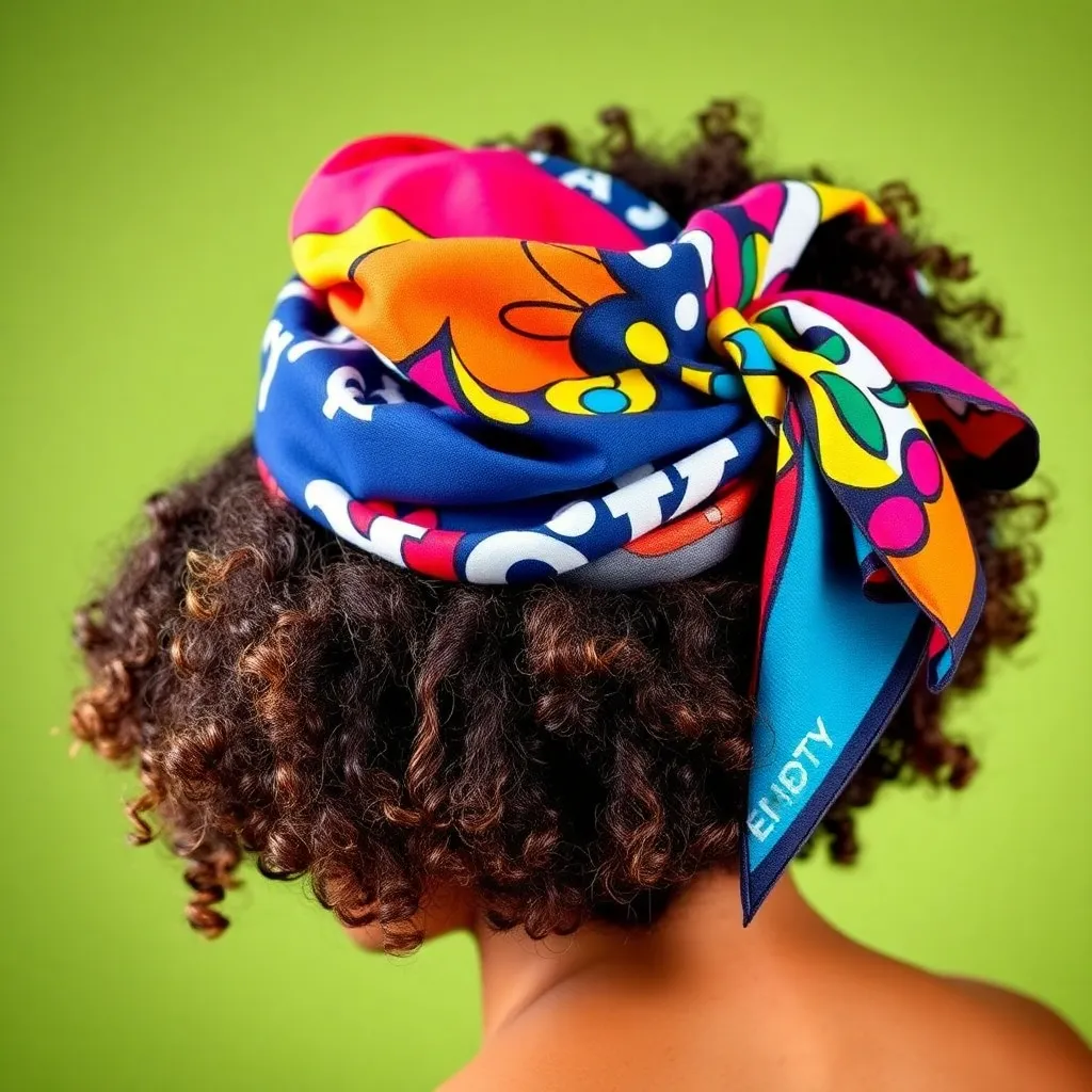 Create a vibrant and stylish image of a hair scarf, showcasing a trendy and eclectic mix of colors, patterns, and textures. The scarf can be wrapped around a curly or straight hairstyle, adding a pop of personality and flair to the overall look. Incorporate bold graphics, florals, or abstract designs.