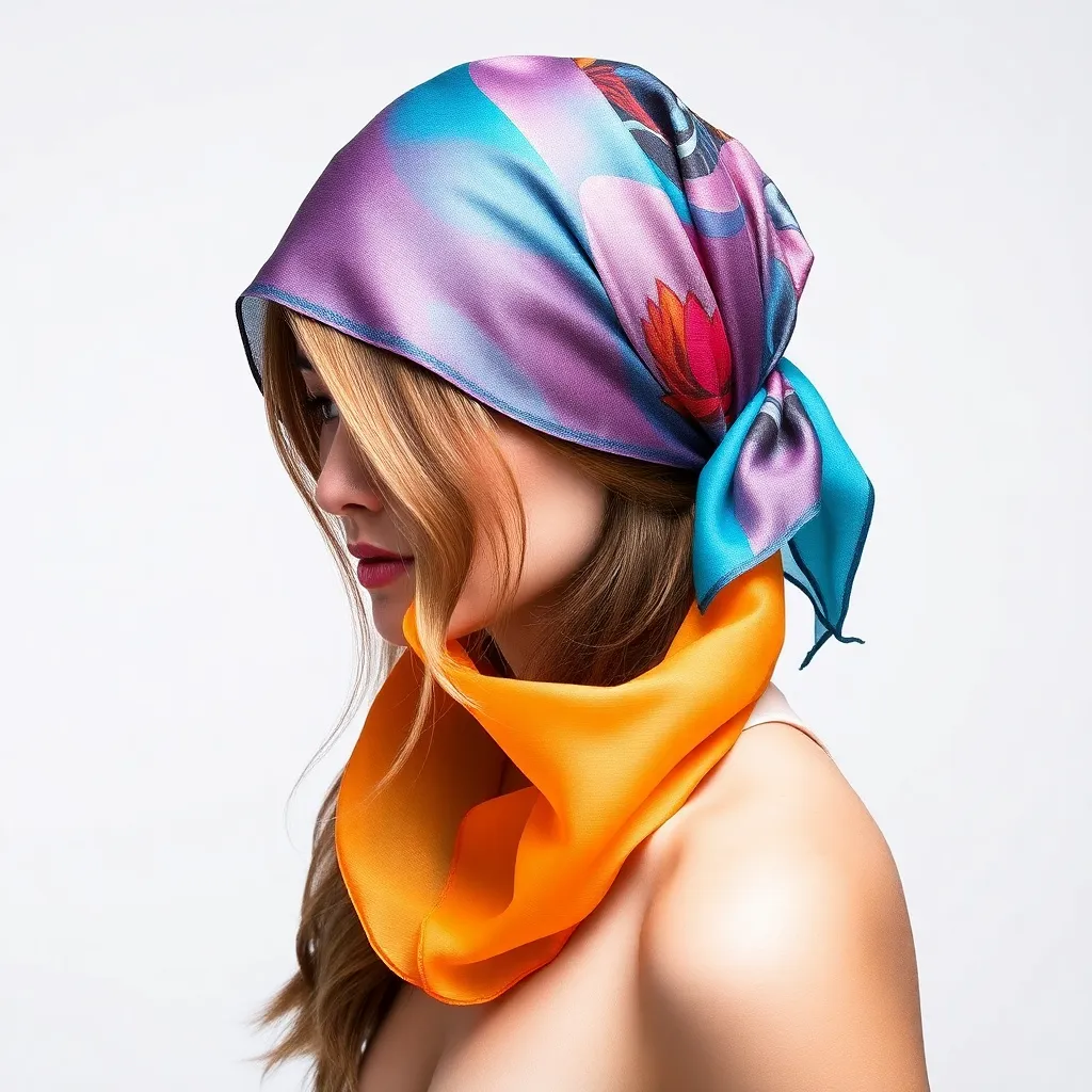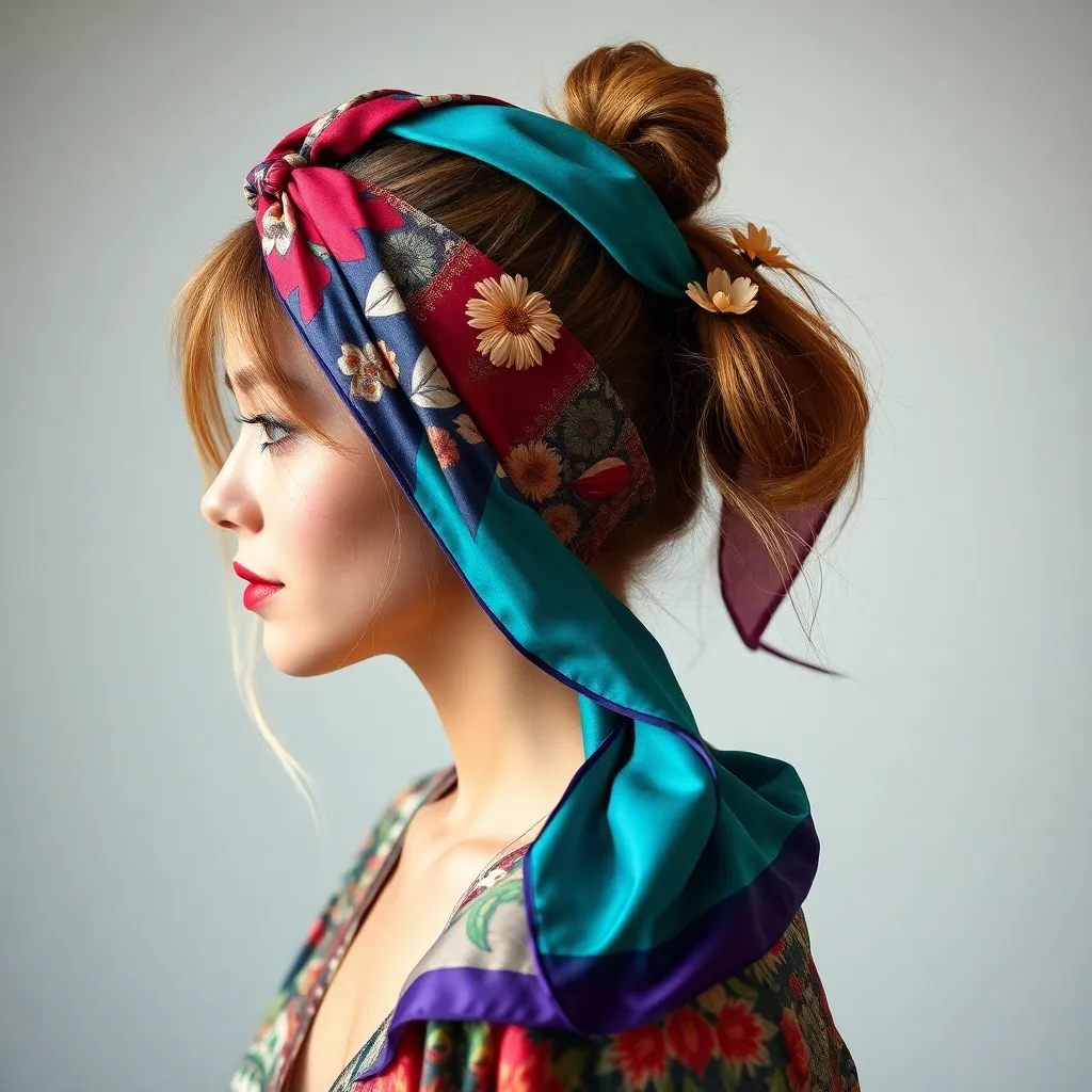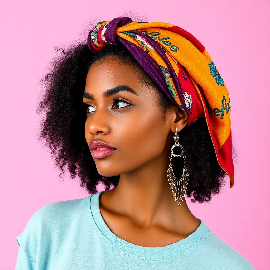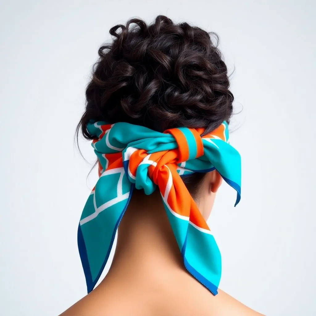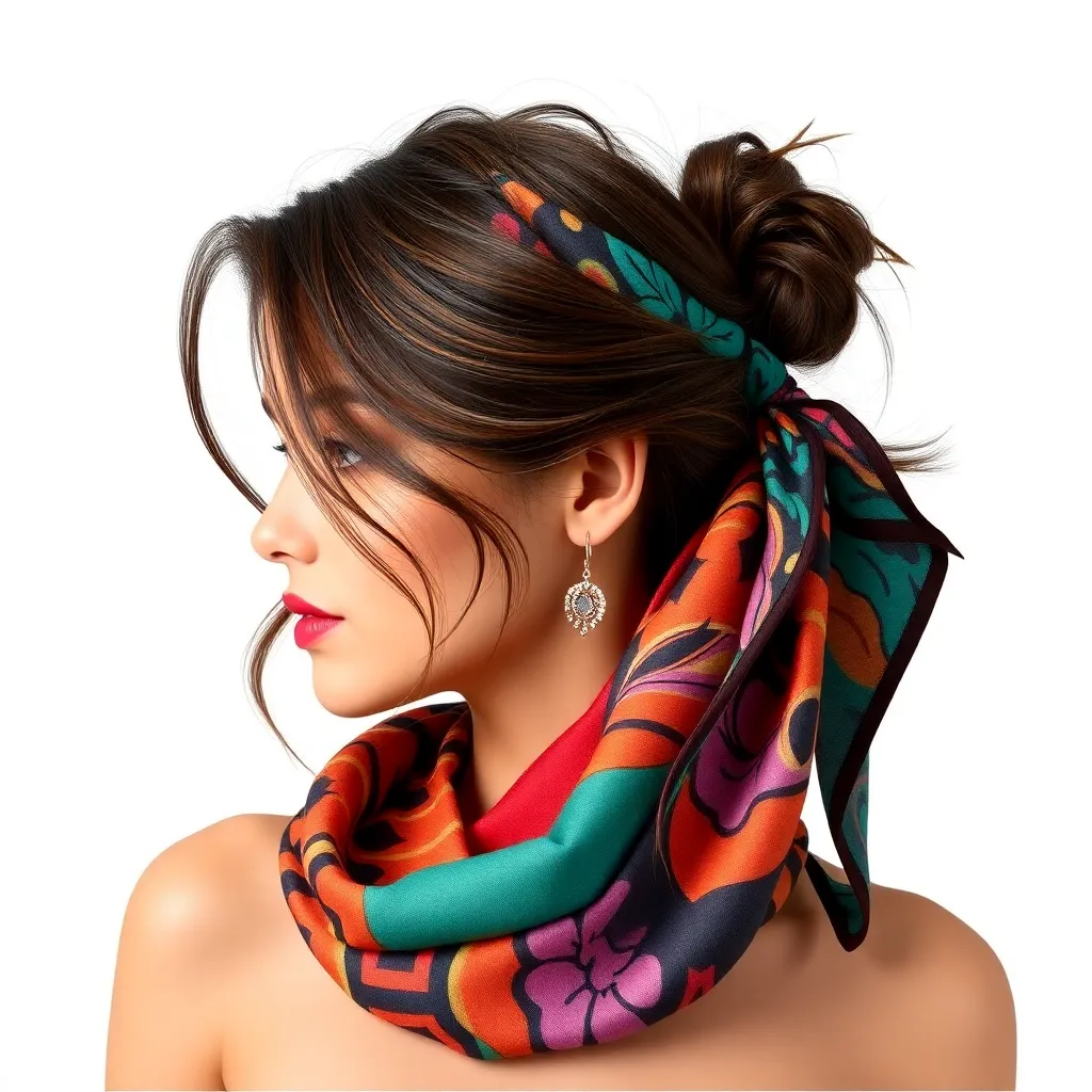 Create a vibrant and stylish image of a hair scarf, showcasing a trendy and eclectic mix of colors, patterns, and textures. The scarf can be wrapped around a curly or straight hairstyle, adding a pop of personality and flair to the overall look. Incorporate bold graphics, florals, or abstract designs.