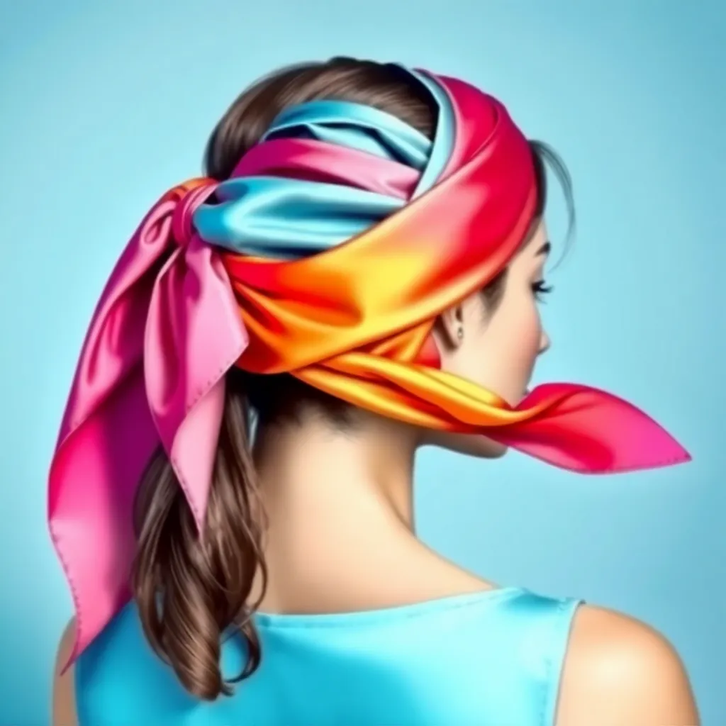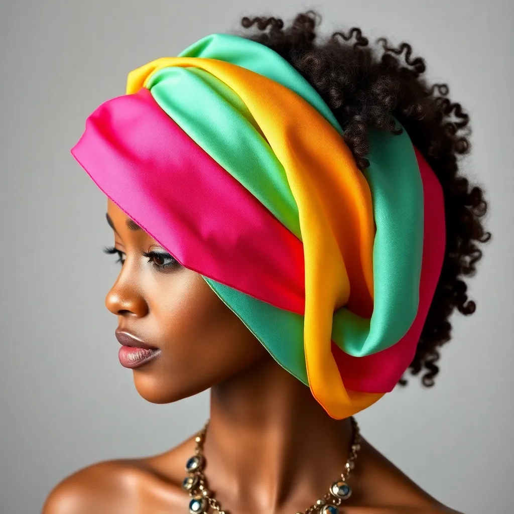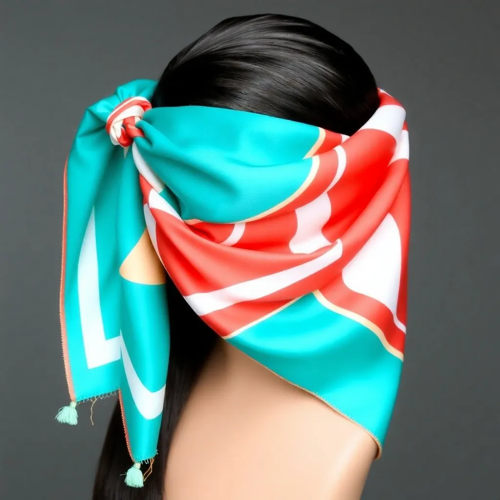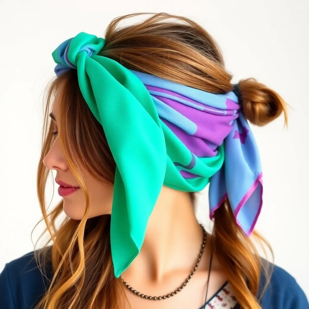 Create a vibrant and stylish image of a hair scarf, showcasing a trendy and eclectic mix of colors, patterns, and textures. The scarf can be wrapped around a curly or straight hairstyle, adding a pop of personality and flair to the overall look. Incorporate bold graphics, florals, or abstract designs.