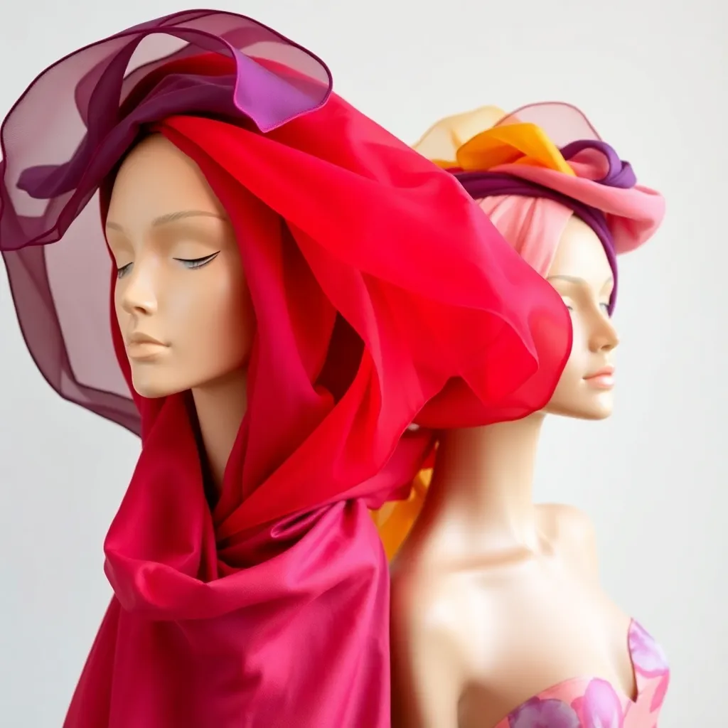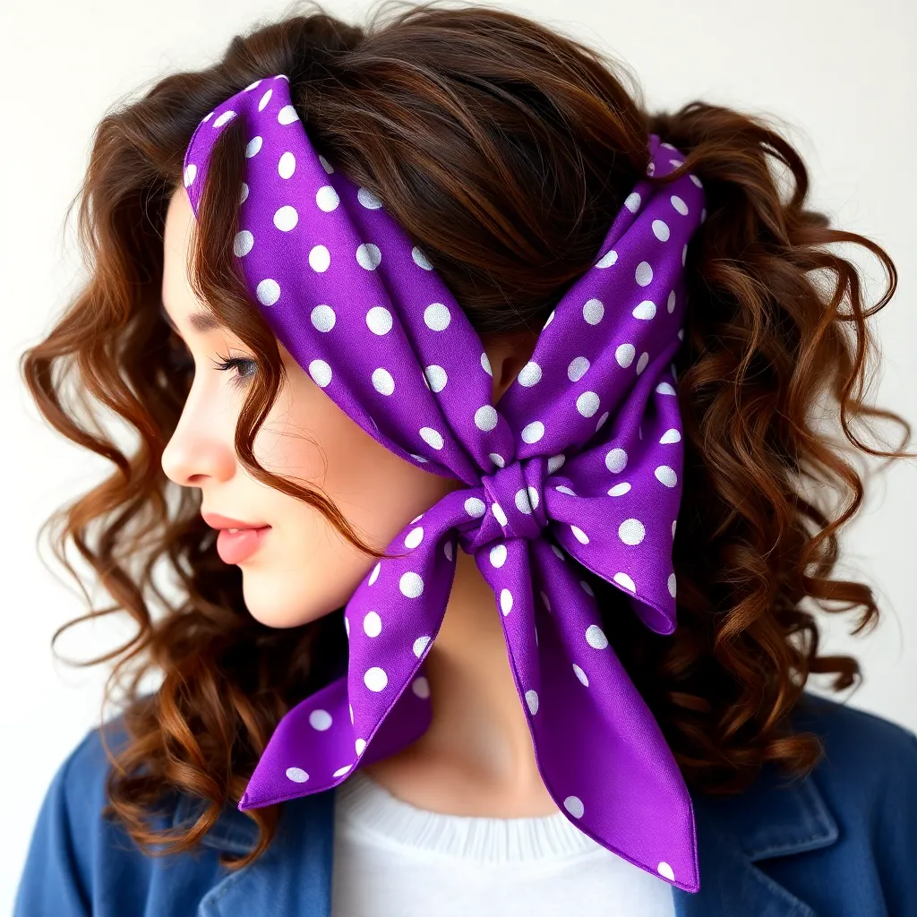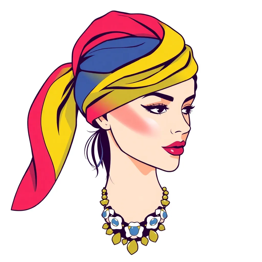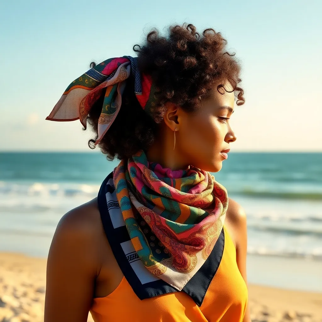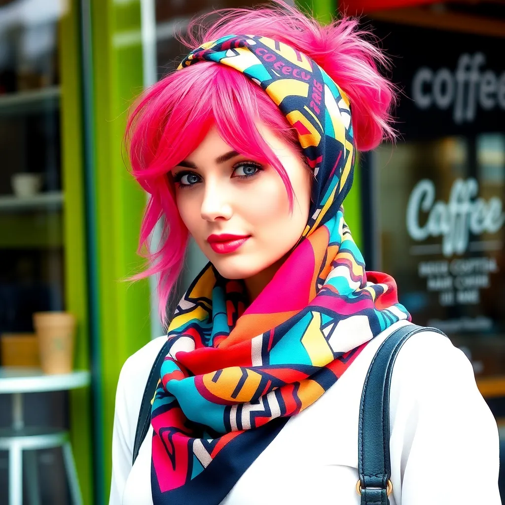 Create a vibrant and stylish image of a hair scarf, showcasing a trendy and eclectic mix of colors, patterns, and textures. The scarf can be wrapped around a curly or straight hairstyle, adding a pop of personality and flair to the overall look. Incorporate bold graphics, florals, or abstract designs.