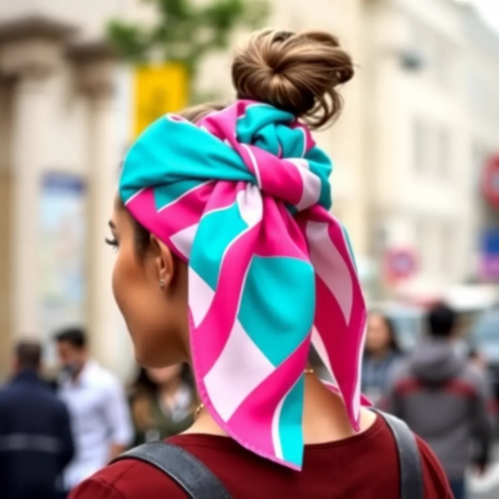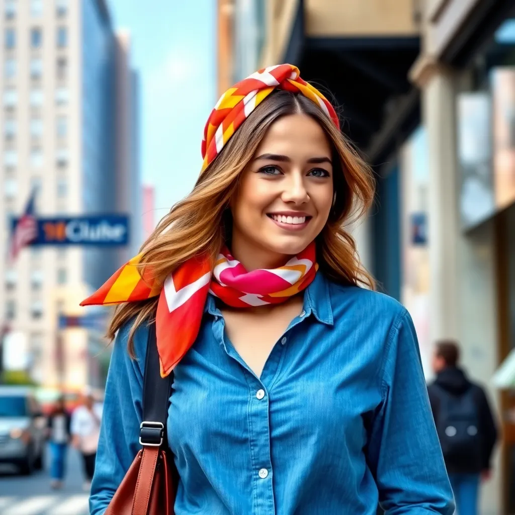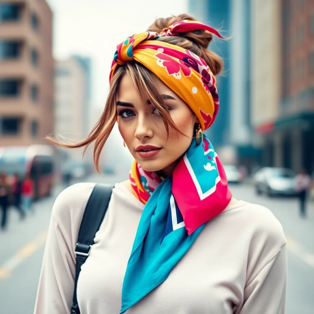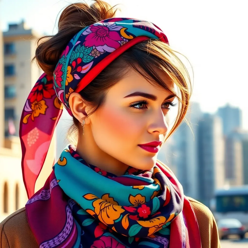 Create a vibrant image of a stylish woman wearing a colorful hair scarf. The scarf should be intricately patterned with florals, stripes, or geometric shapes. The woman's hair should be styled in a trendy updo, with loose strands framing her face. The background should be a warm, sunny day with a cityscape.