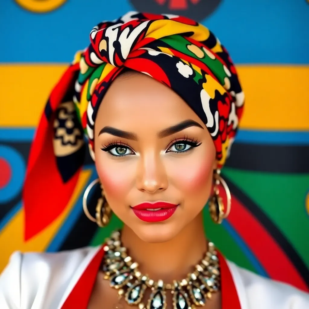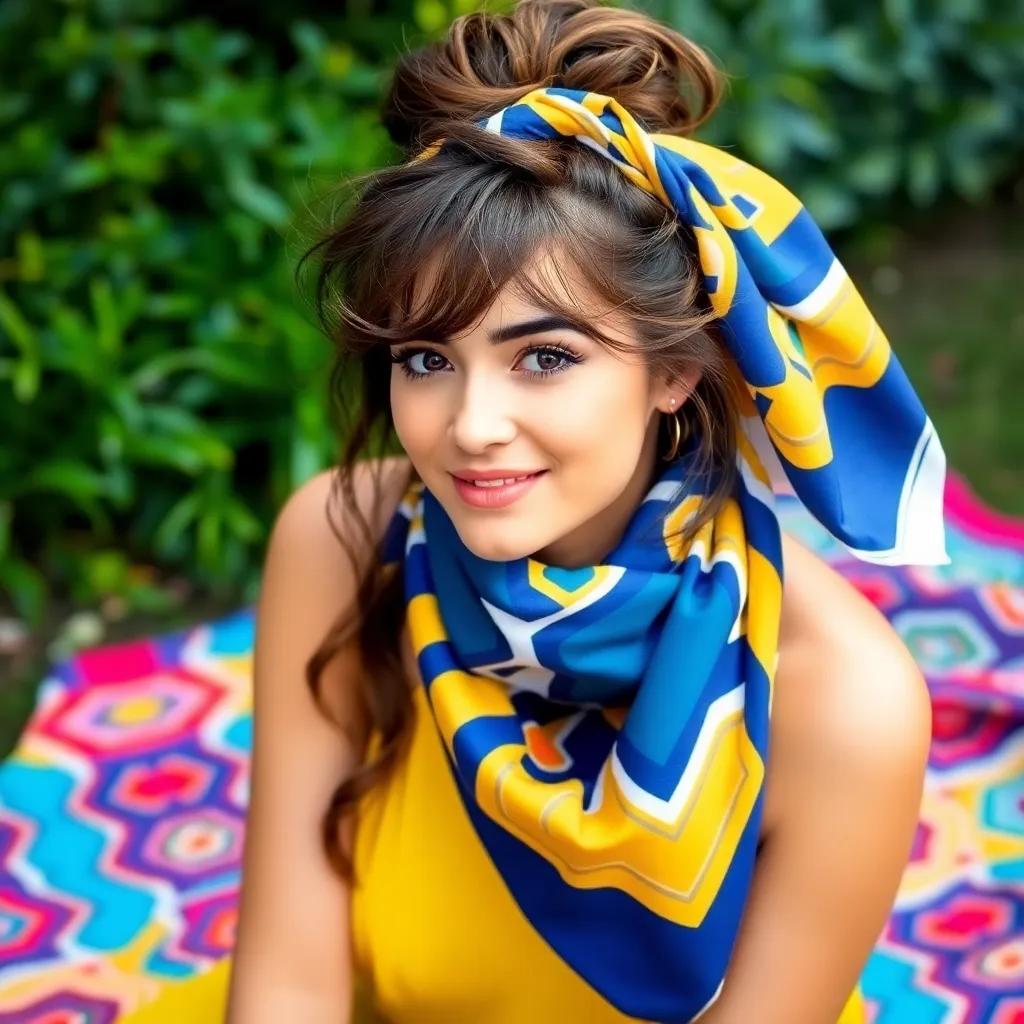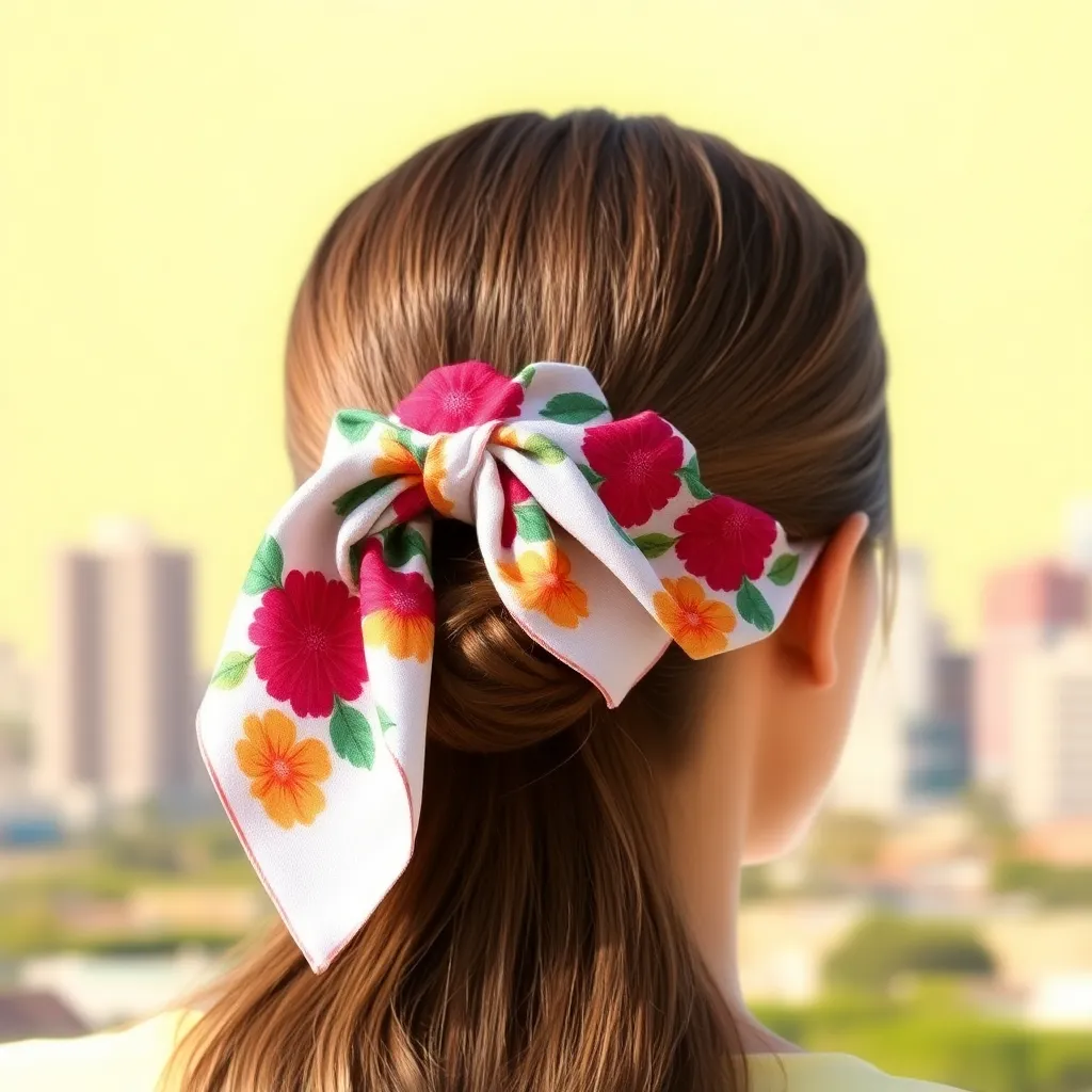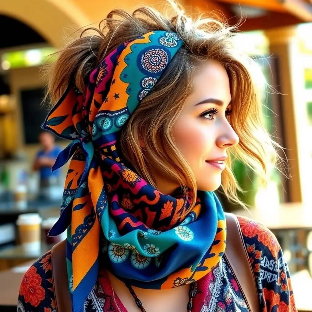 Create a vibrant image of a stylish woman wearing a colorful hair scarf. The scarf should be intricately patterned with florals, stripes, or geometric shapes. The woman's hair should be styled in a trendy updo, with loose strands framing her face. The background should be a warm, sunny day with a cityscape.