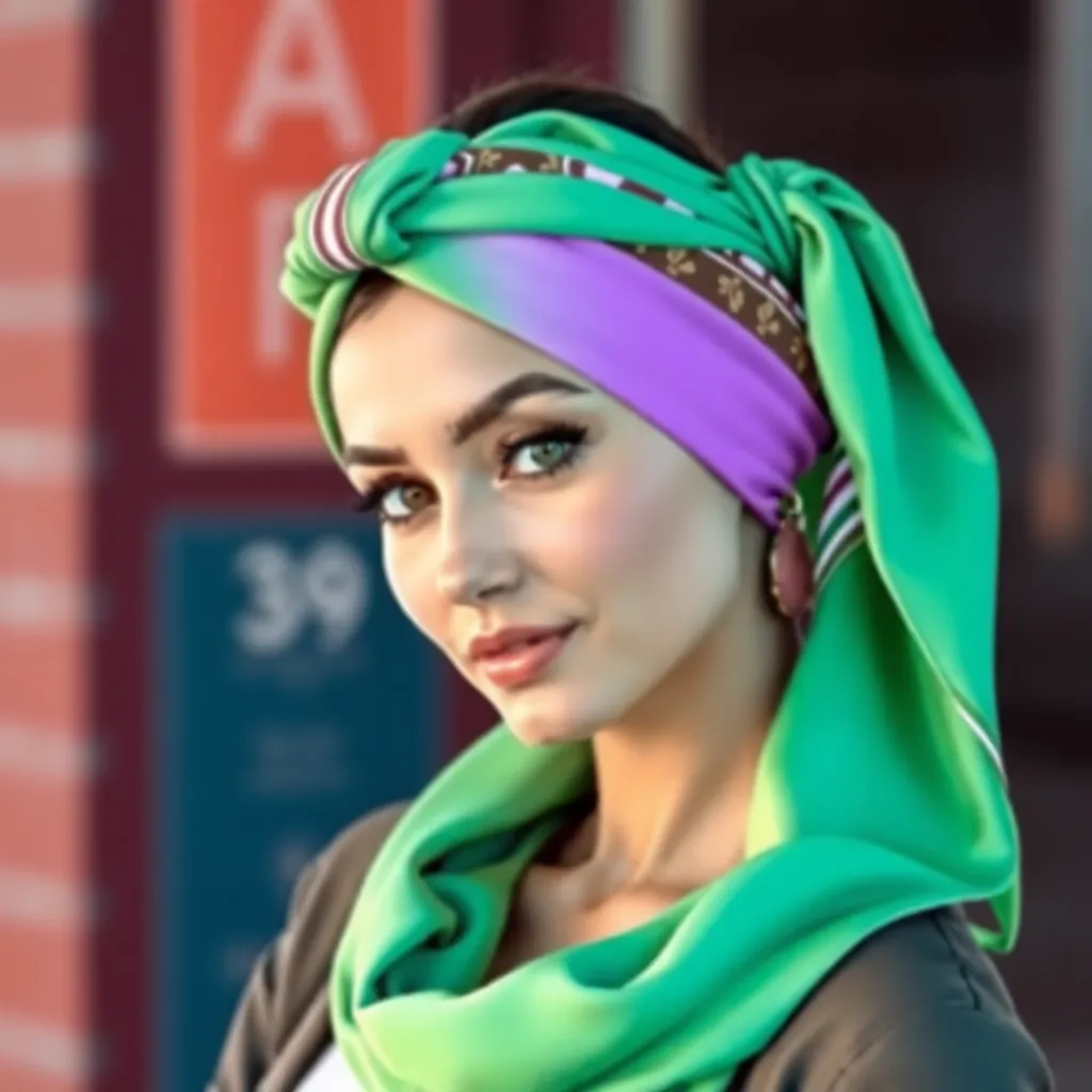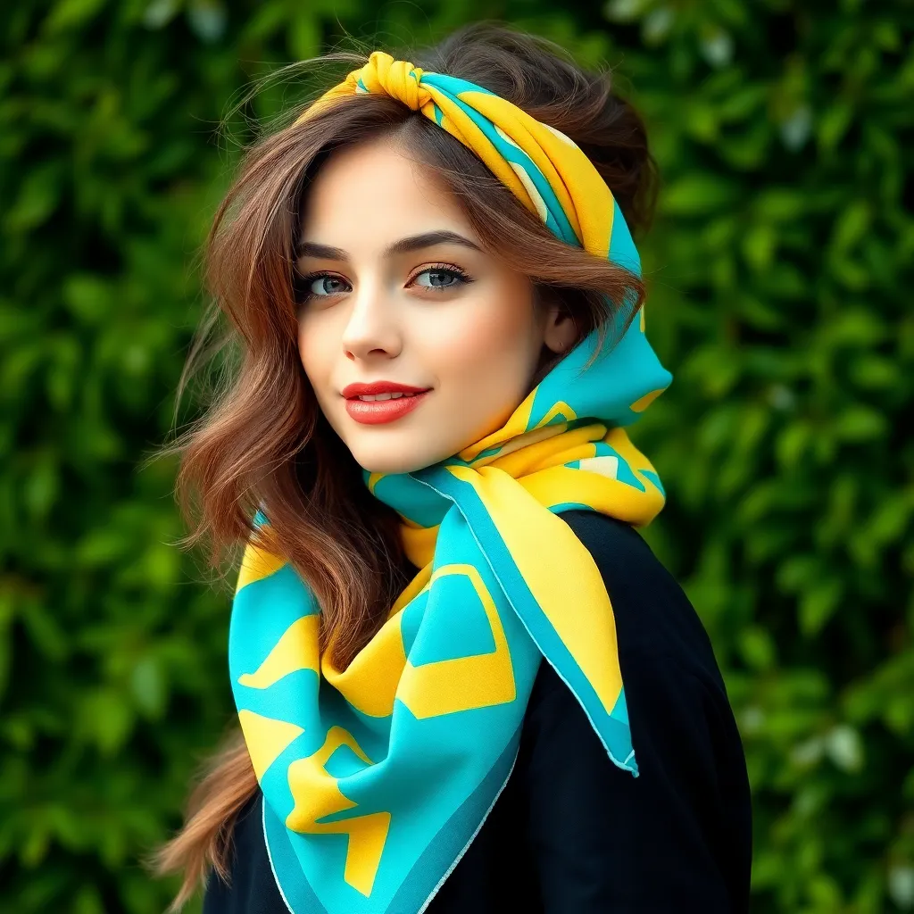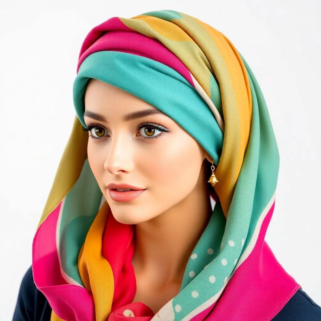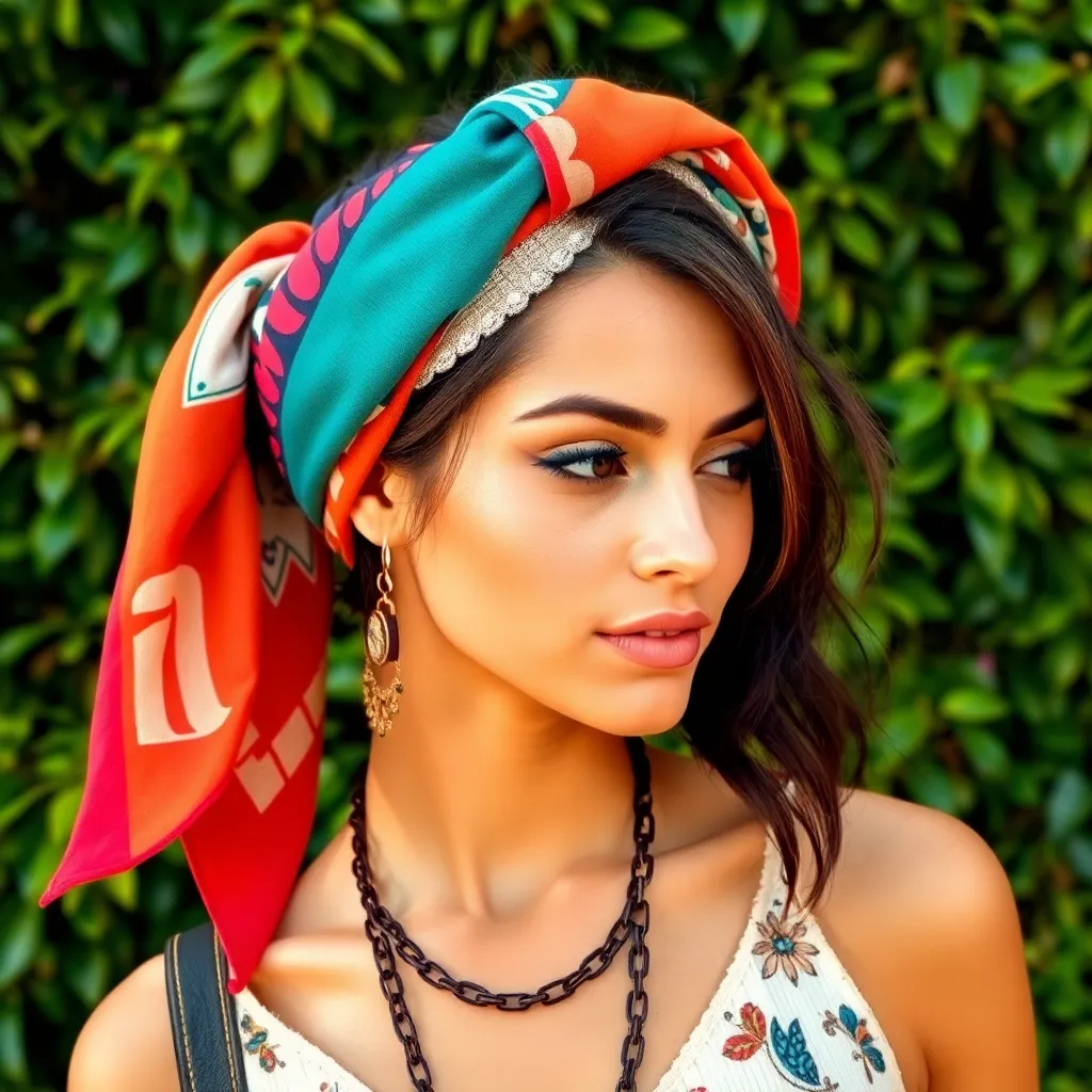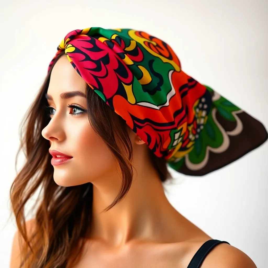 Create a stunning image of a hair scarf in a vibrant color palette, featuring a flowing design with intricate patterns and textures. The scarf should be wrapped elegantly around a young woman's head, with loose strands framing her face and a few wisps framing her shoulders, conveying a sense of effortless chic.
