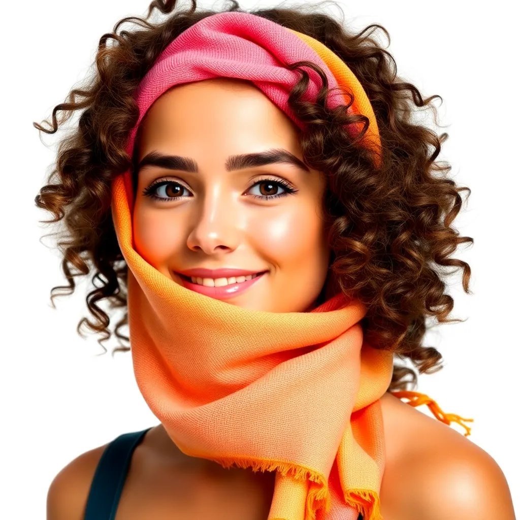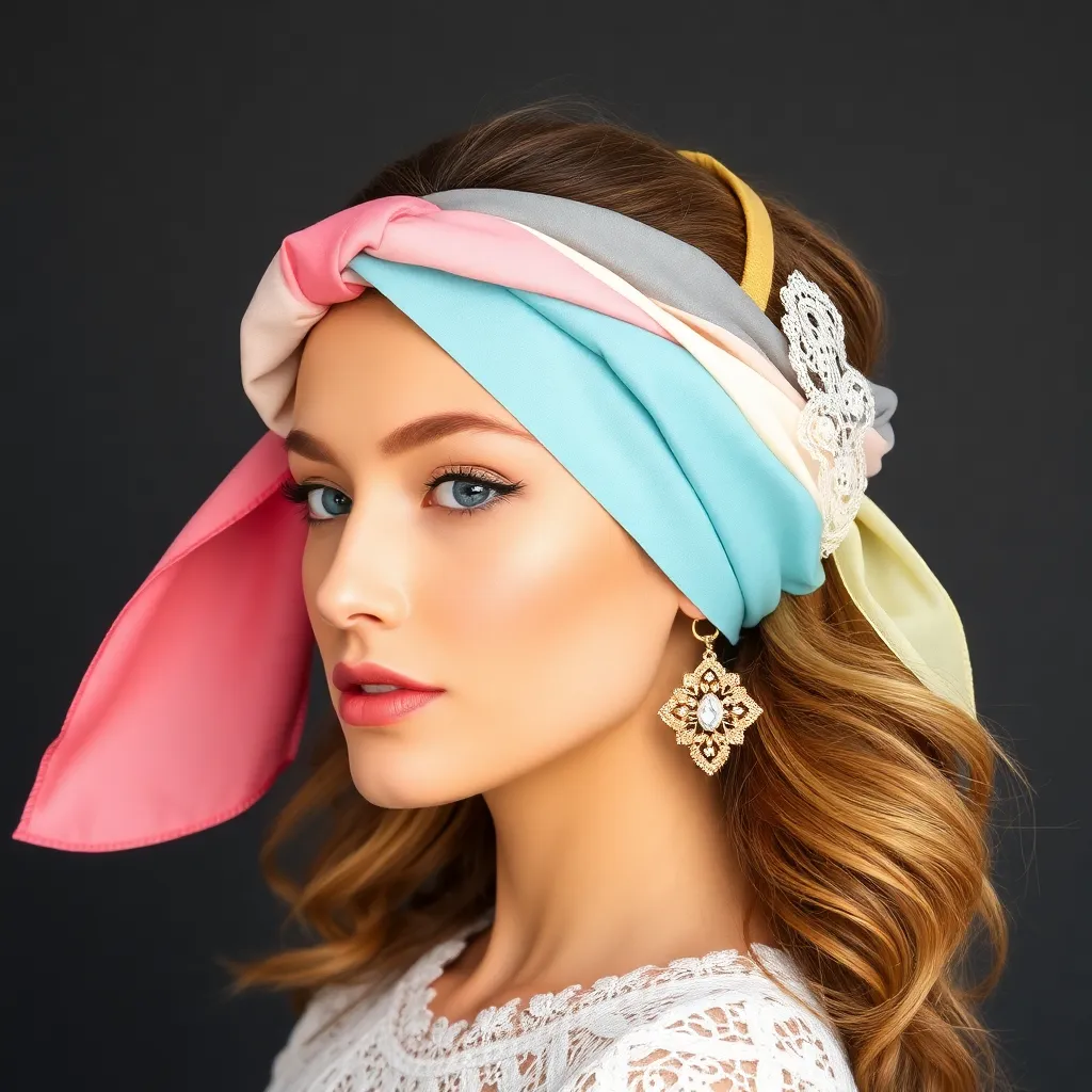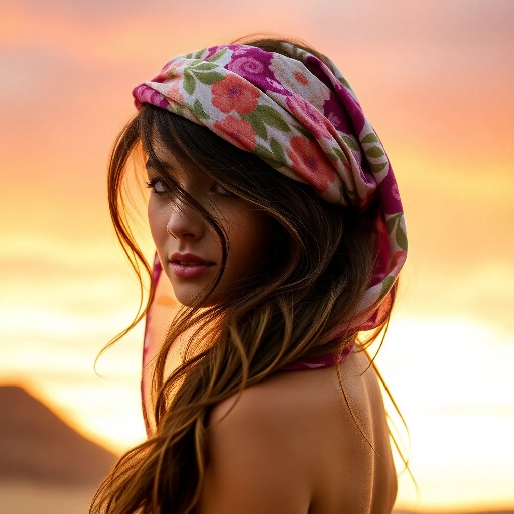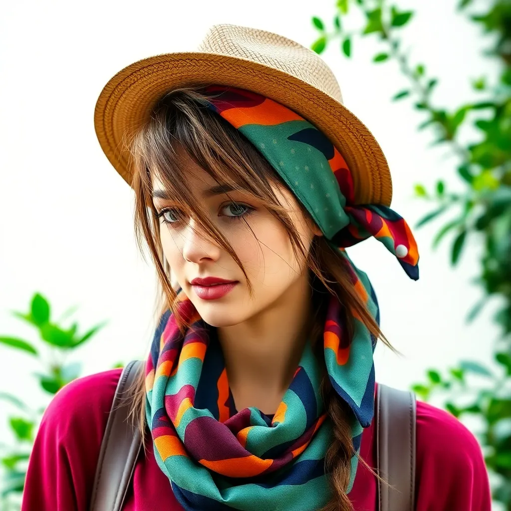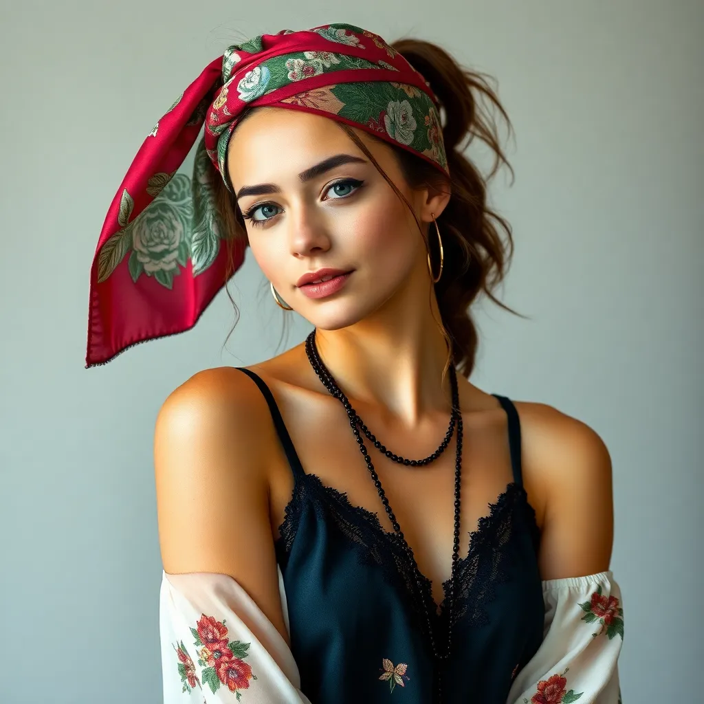 Create a stunning image of a hair scarf in a vibrant color palette, featuring a flowing design with intricate patterns and textures. The scarf should be wrapped elegantly around a young woman's head, with loose strands framing her face and a few wisps framing her shoulders, conveying a sense of effortless chic.