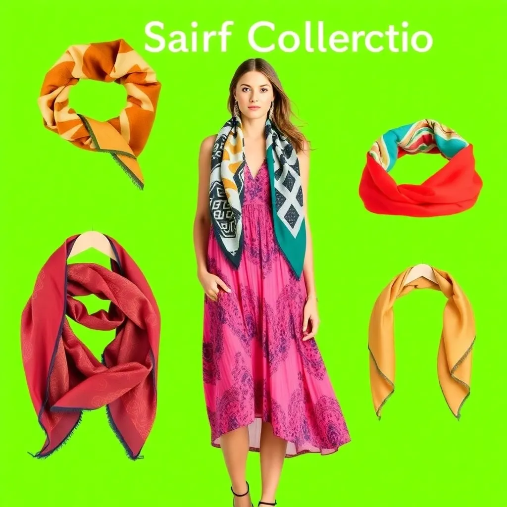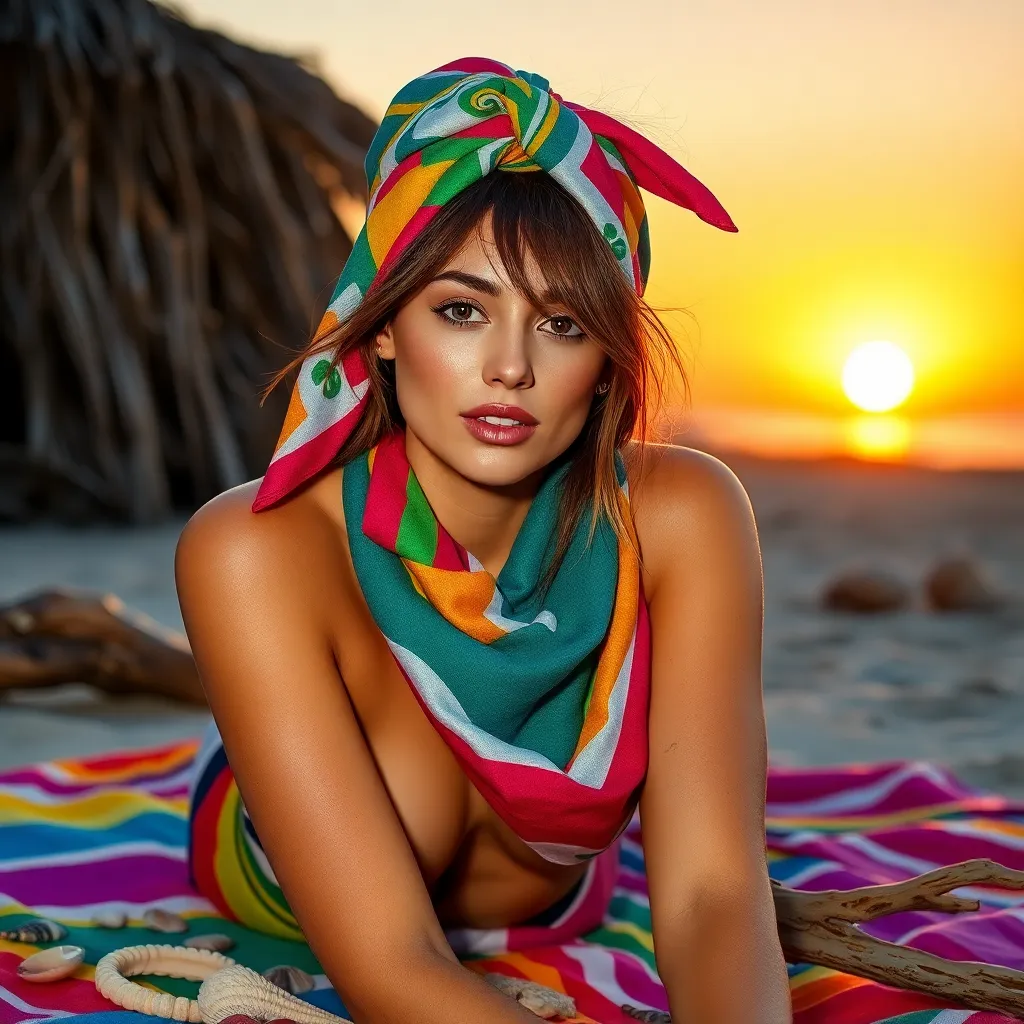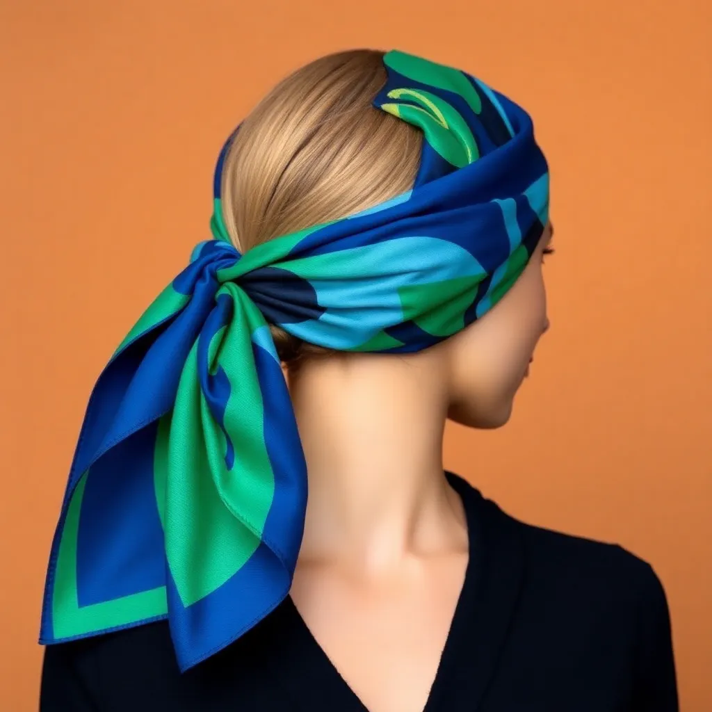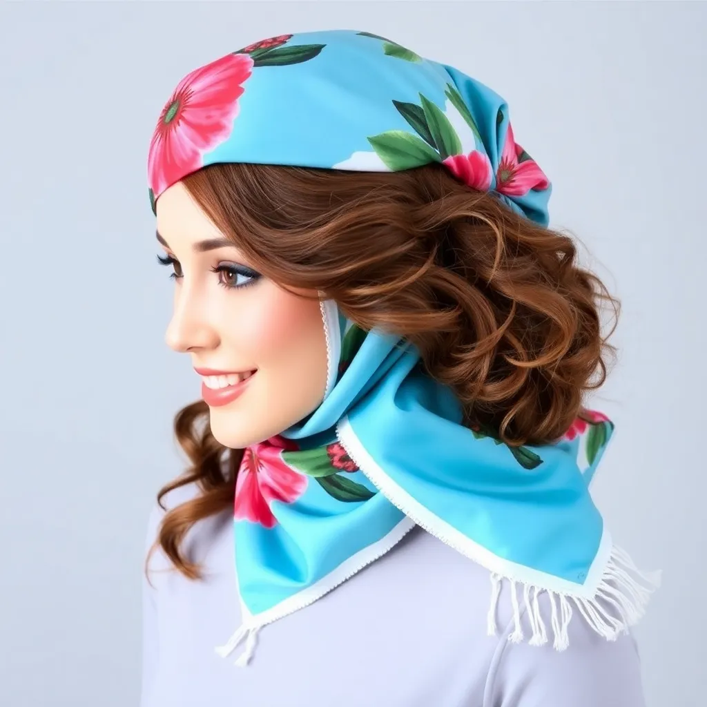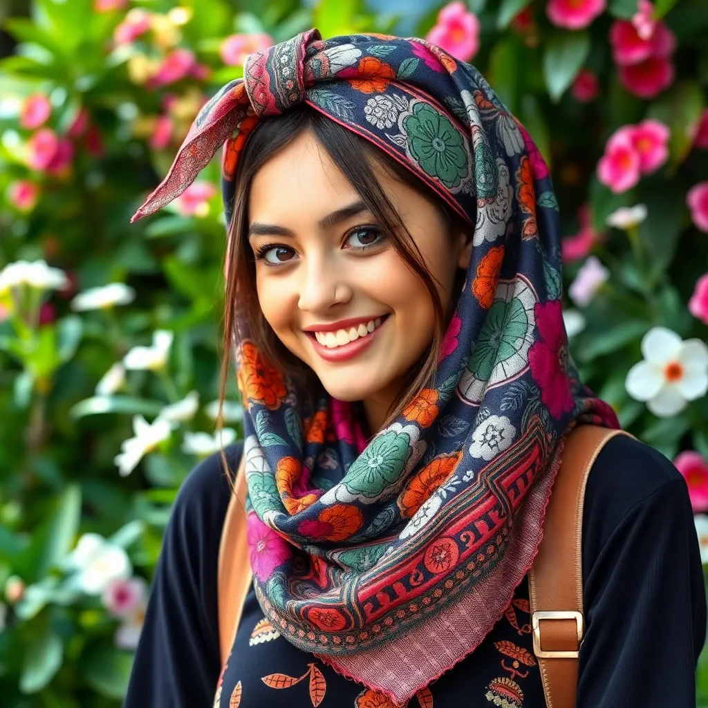 Create a stunning image of a hair scarf in a vibrant color palette, featuring a flowing design with intricate patterns and textures. The scarf should be wrapped elegantly around a young woman's head, with loose strands framing her face and a few wisps framing her shoulders, conveying a sense of effortless chic.