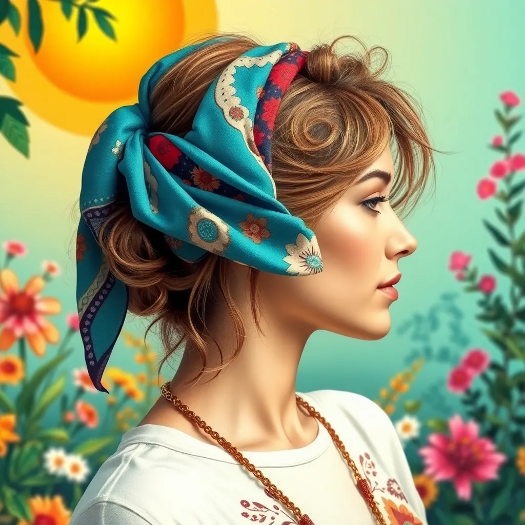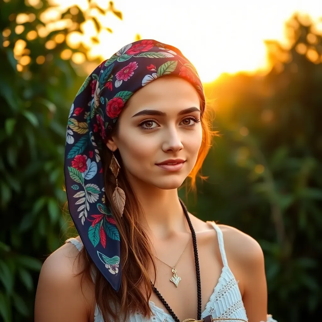 Create a vibrant and stylish image of a hair scarf in a bohemian-inspired setting. The scarf should be wrapped around a woman's head in a trendy knot, with a colorful background featuring flowers, leaves, and a warm sunny glow. Incorporate natural textures and earthy tones to evoke a sense of serenity.