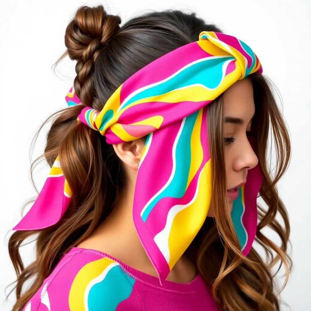 Create a vibrant image of a hair scarf adorning a trendy hairstyle. The scarf should feature a bold, abstract pattern in shades of bright pink, turquoise, and yellow. The hair should be styled in loose, effortless waves with a few strategically placed braids. The overall vibe should be youthful and carefree.