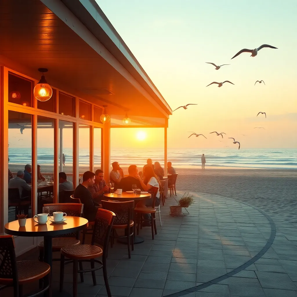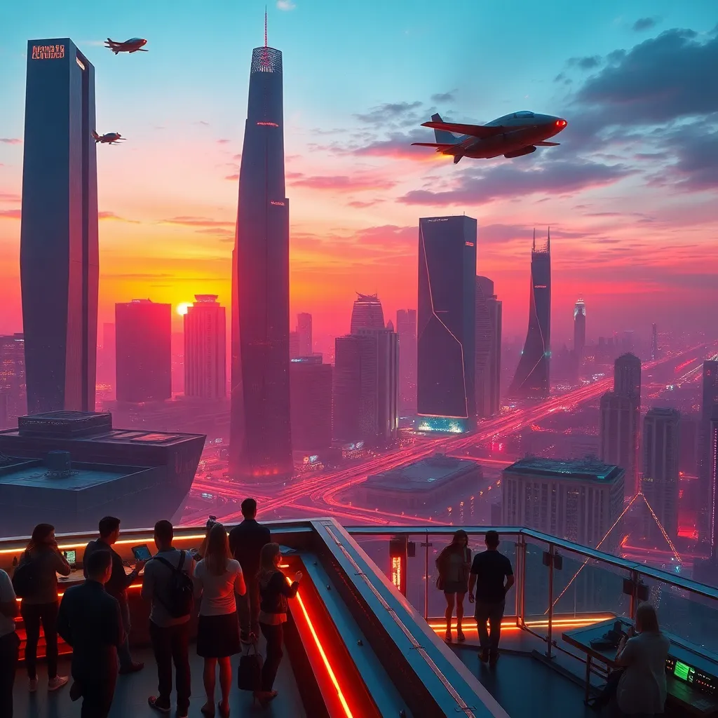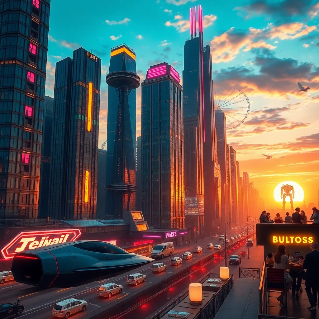 Create a futuristic cityscape at sunset, with sleek skyscrapers, vibrant neon lights, and a bustling street scene. Incorporate a hovercar flying by, a giant robot in the distance, and a group of people enjoying the evening atmosphere on the rooftop bar. Use a warm color palette and high-contrast lighting.