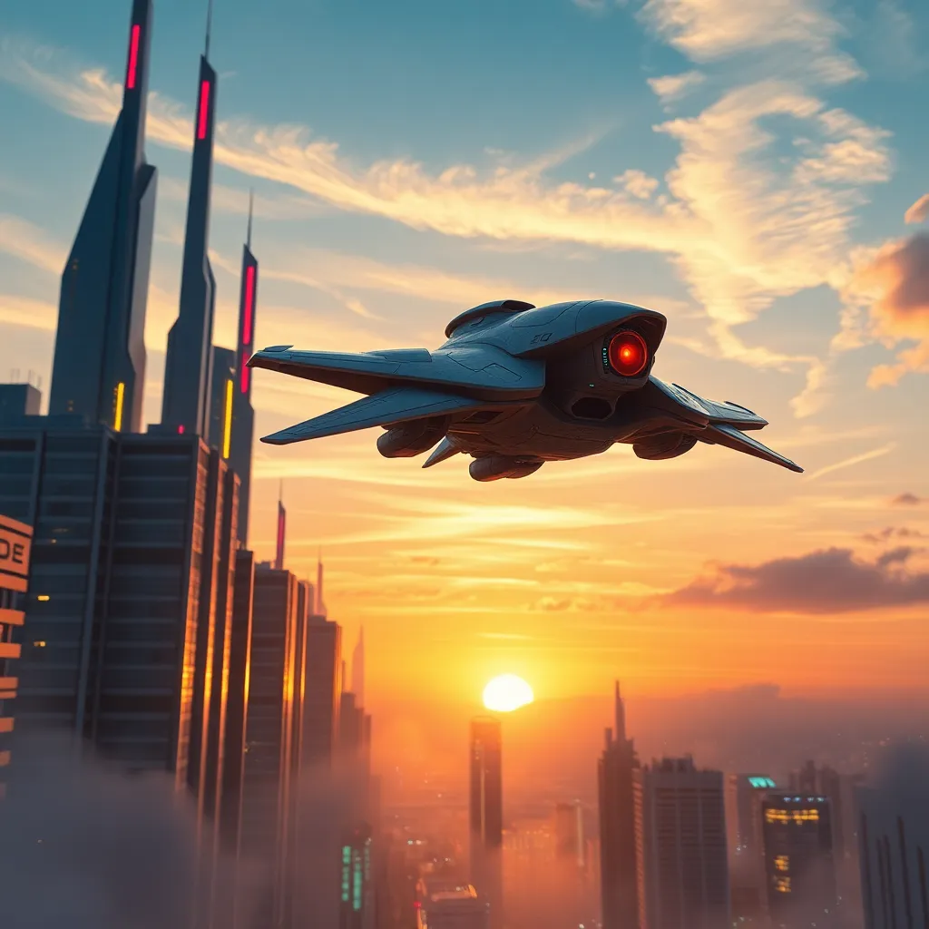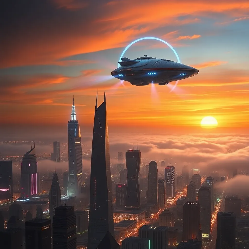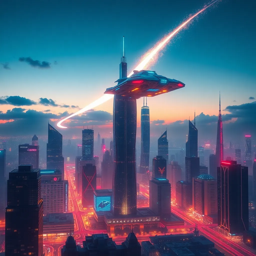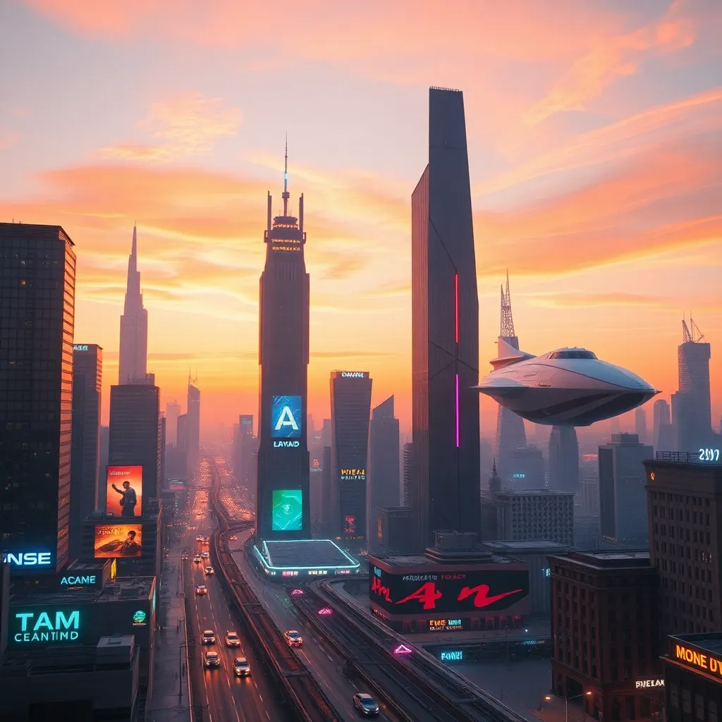 Create a futuristic cityscape at sunset, with sleek skyscrapers and flying cars zipping by. Incorporate vibrant neon lights, a sprawling city square, and a massive spaceship docked in the distance. Use a warm color palette with pops of blue and purple to capture the essence of a futuristic metropolis.